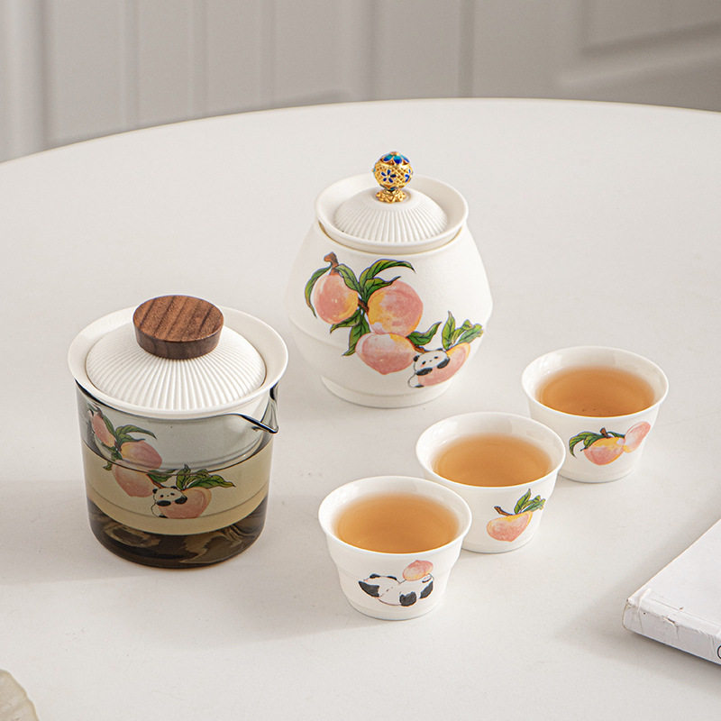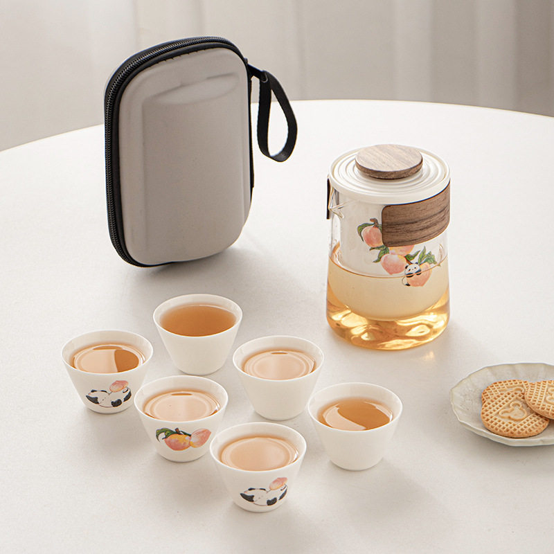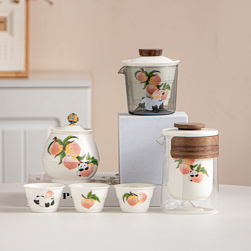 📚 淘气满满熊猫寿桃旅行茶具精致便携式旅行户外泡茶壶快客杯全套