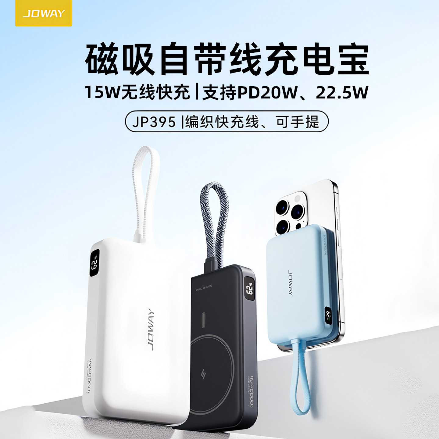 📚 Joway乔威磁吸自带线充电宝3c认证可上飞机移动电源适用苹果小米华为10000毫安大容量无线15W快充小巧便携