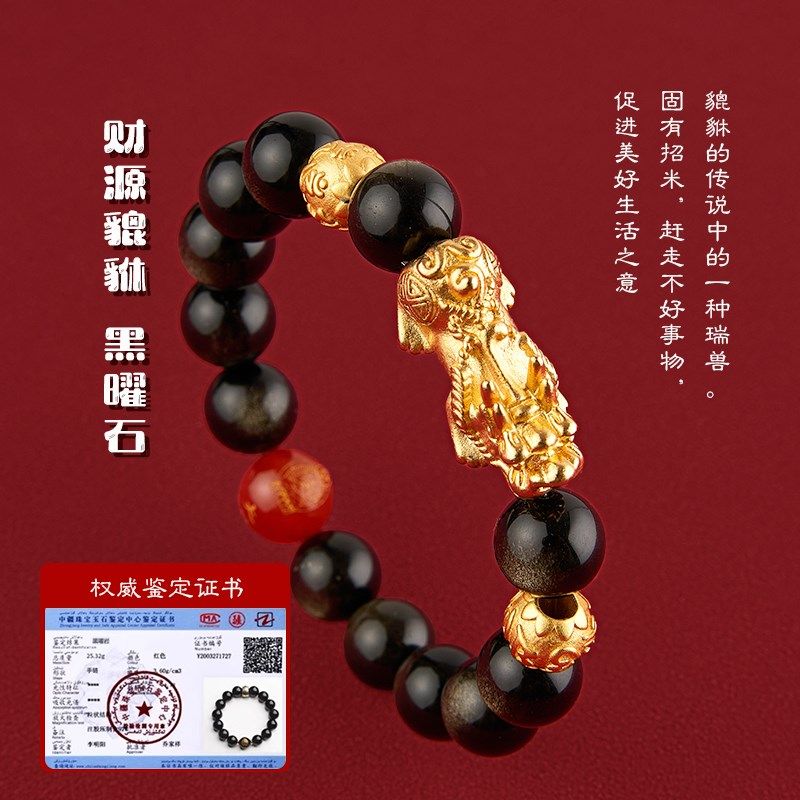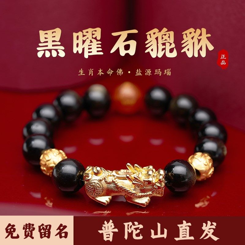 📚 普陀山收藏天然黑耀石貔貅手串本命年十二生肖咬金貔貅本命佛手链