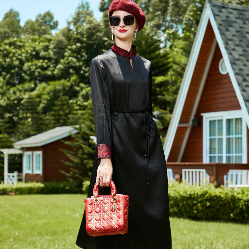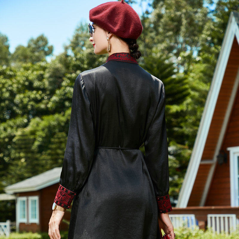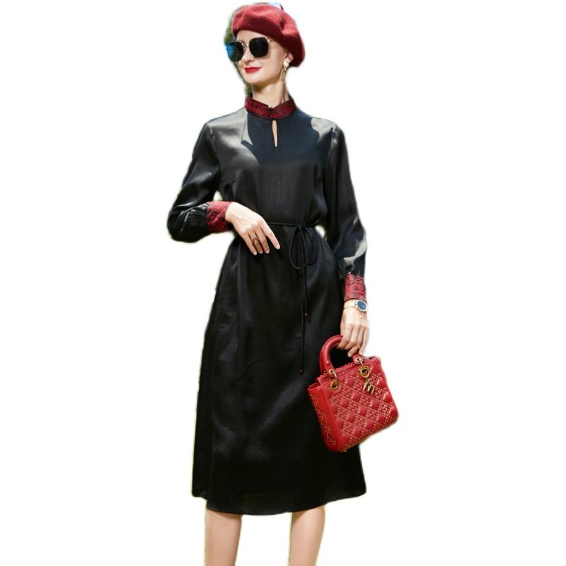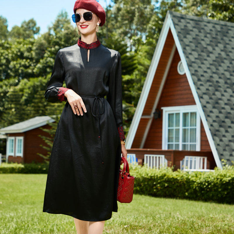📚 真丝连衣裙女2023新款春装中长款复古小立领绣花香云纱裙子连衣裙