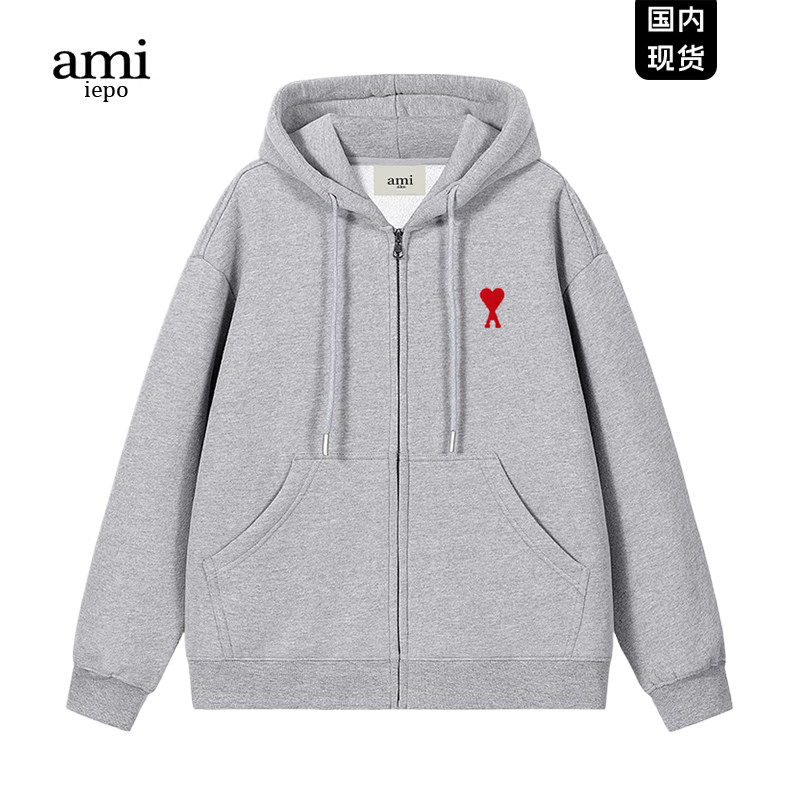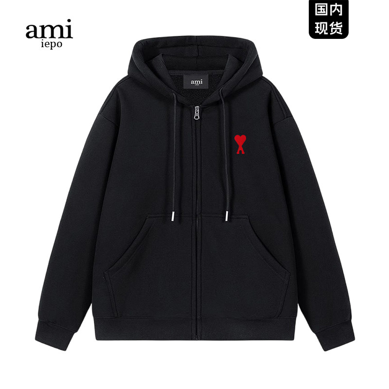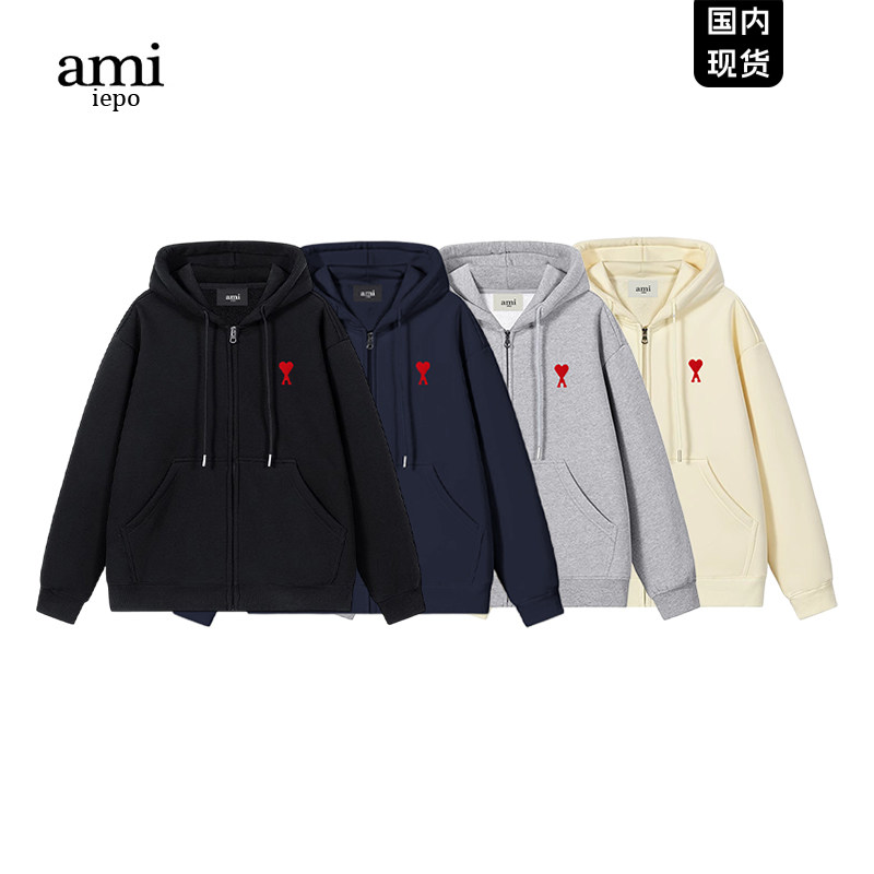 📚 Ami iepo官方杏色开衫卫衣男女秋冬加绒加厚外套百搭重磅拉链帽衫