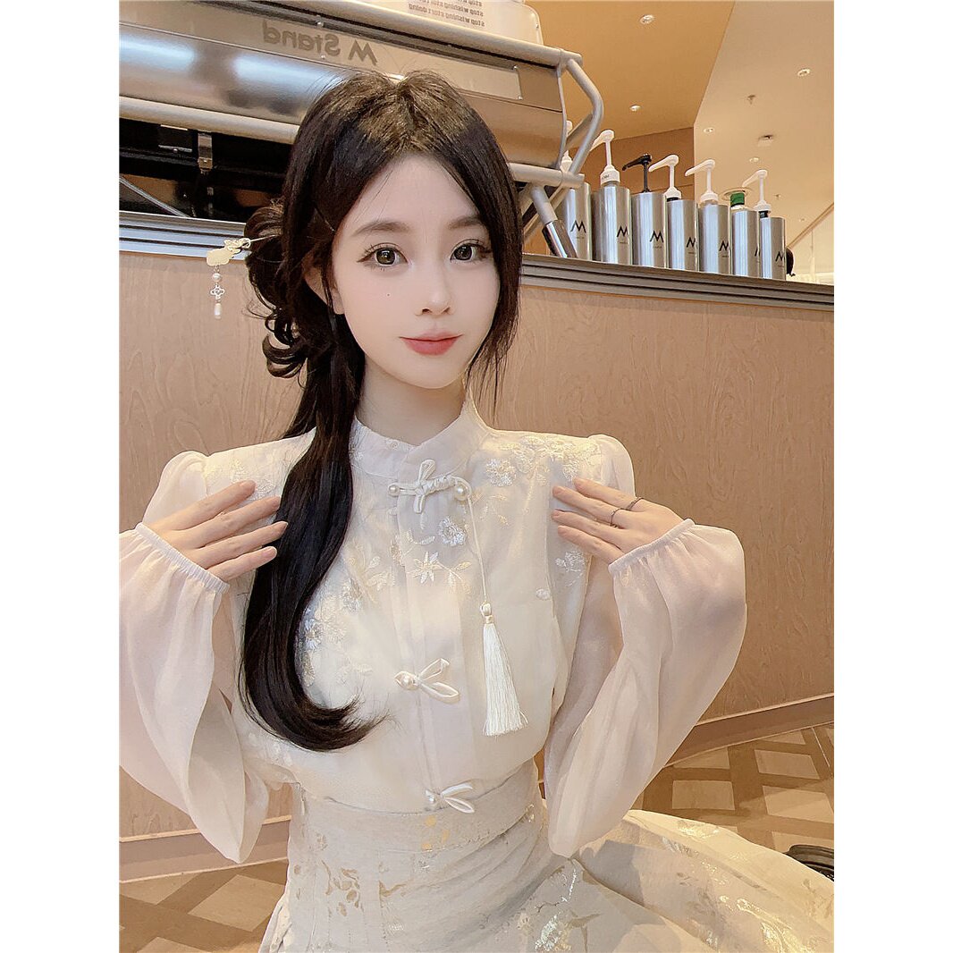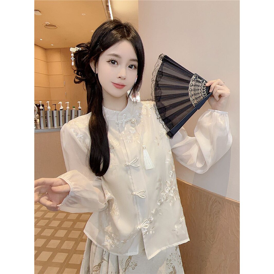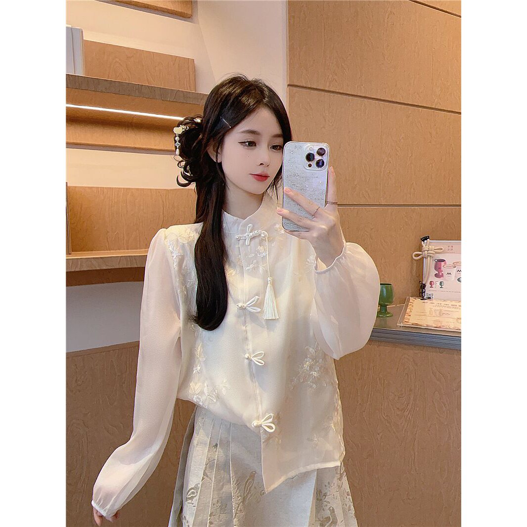 📚 新中式盘扣改良旗袍衬衫女2025春季新款复古国风小众刺绣长袖上衣