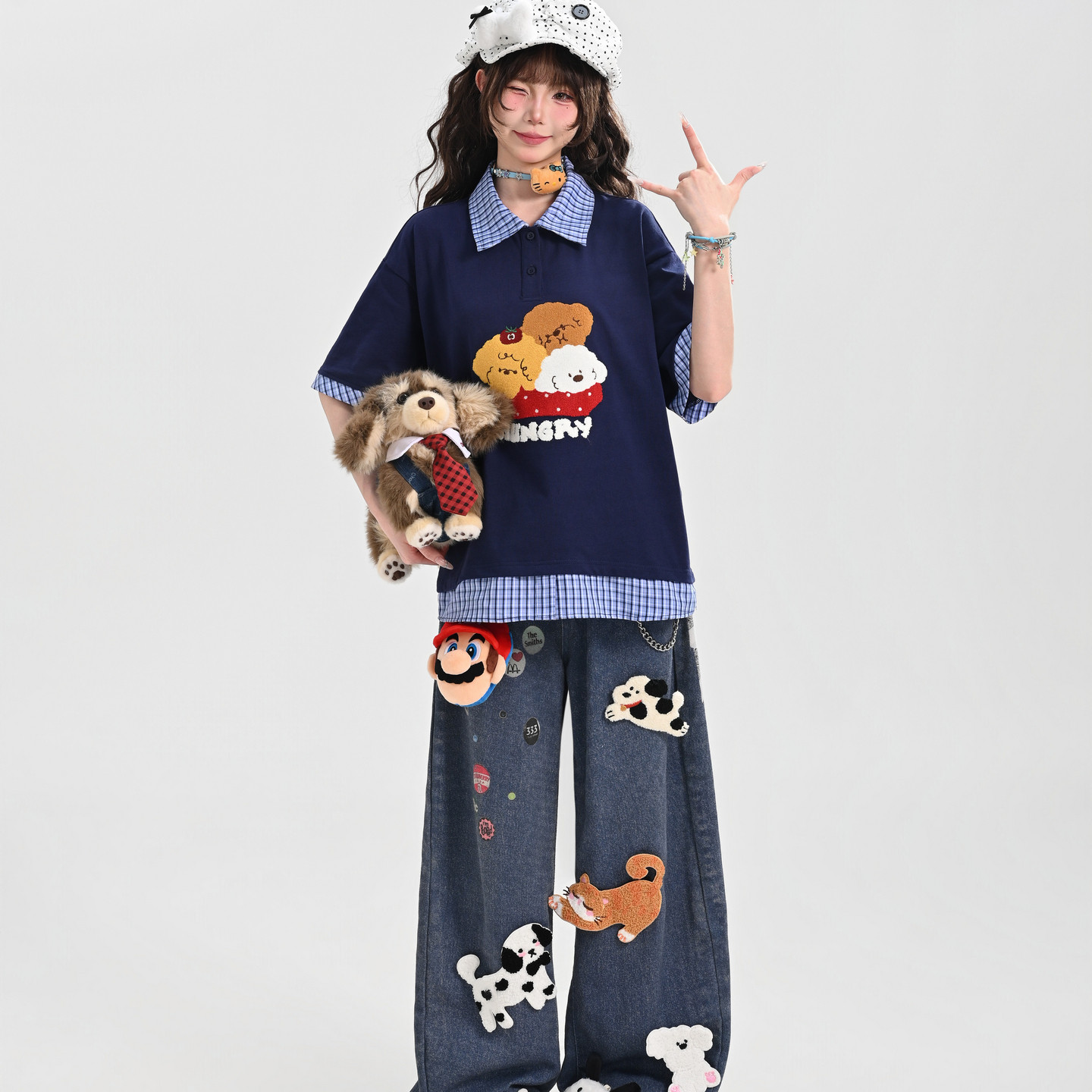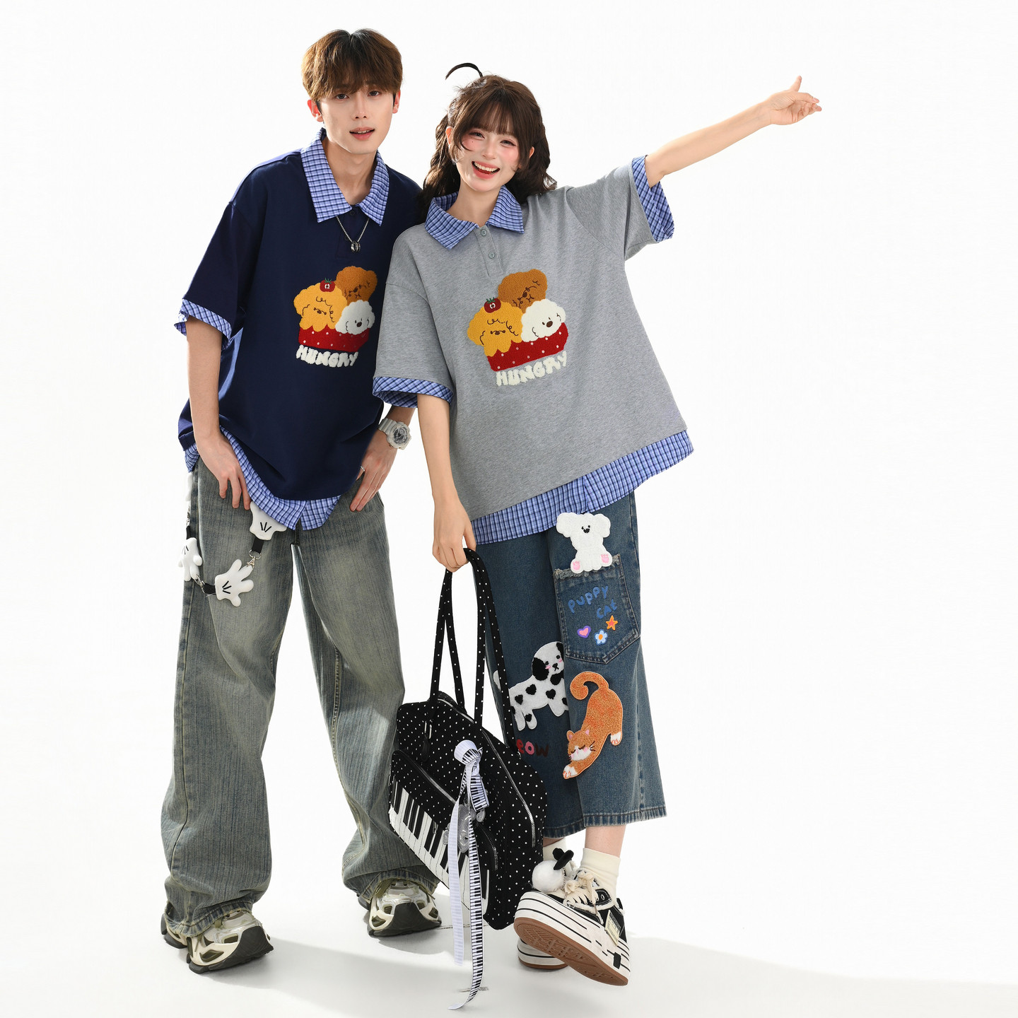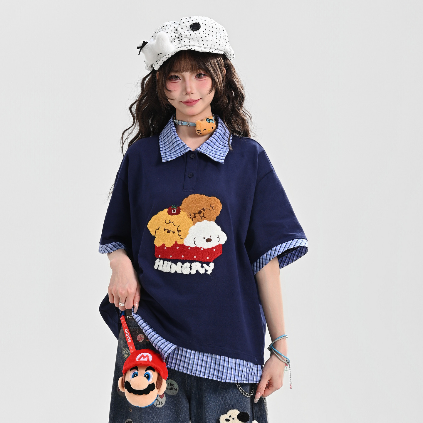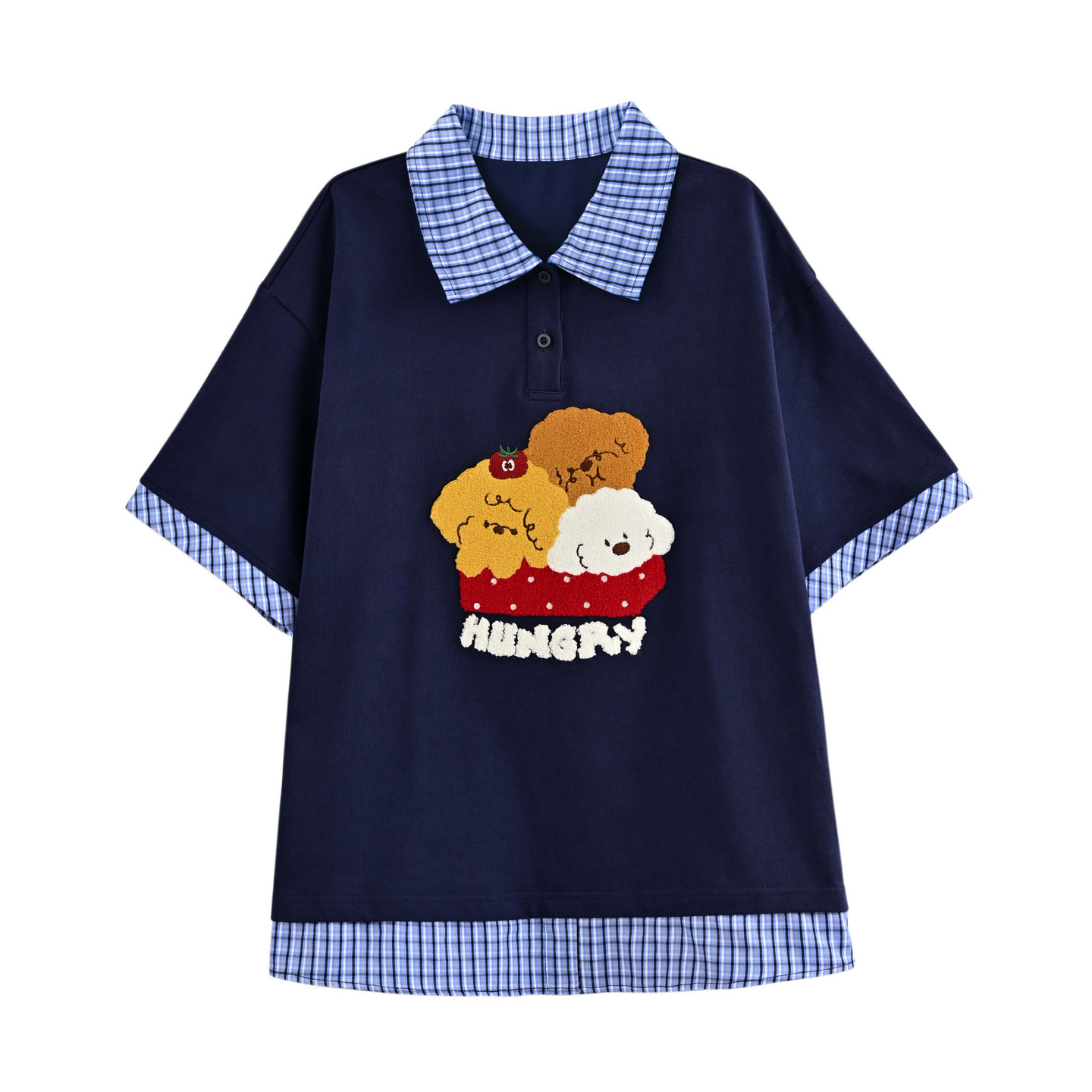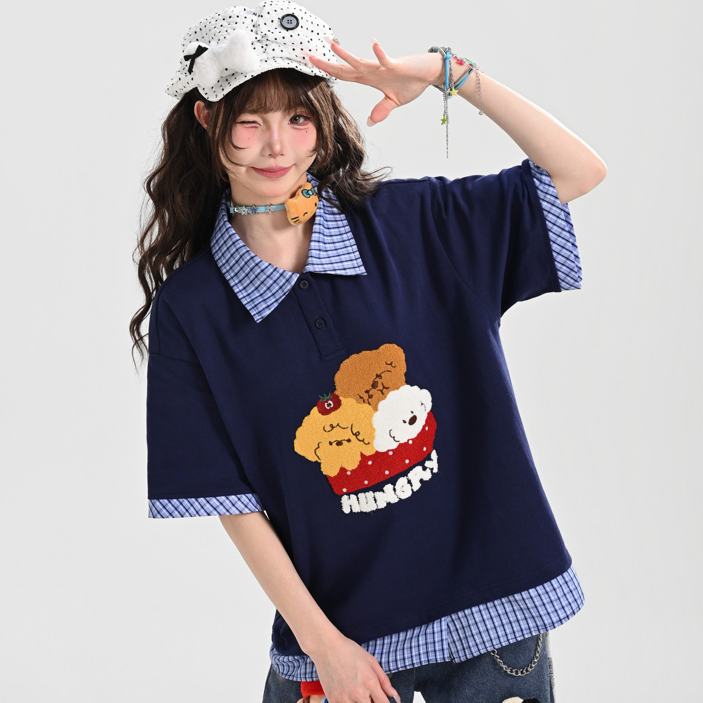 📚 森女部落甜美风格子拼接设计感宽松短袖t恤女2026新款翻领上衣夏