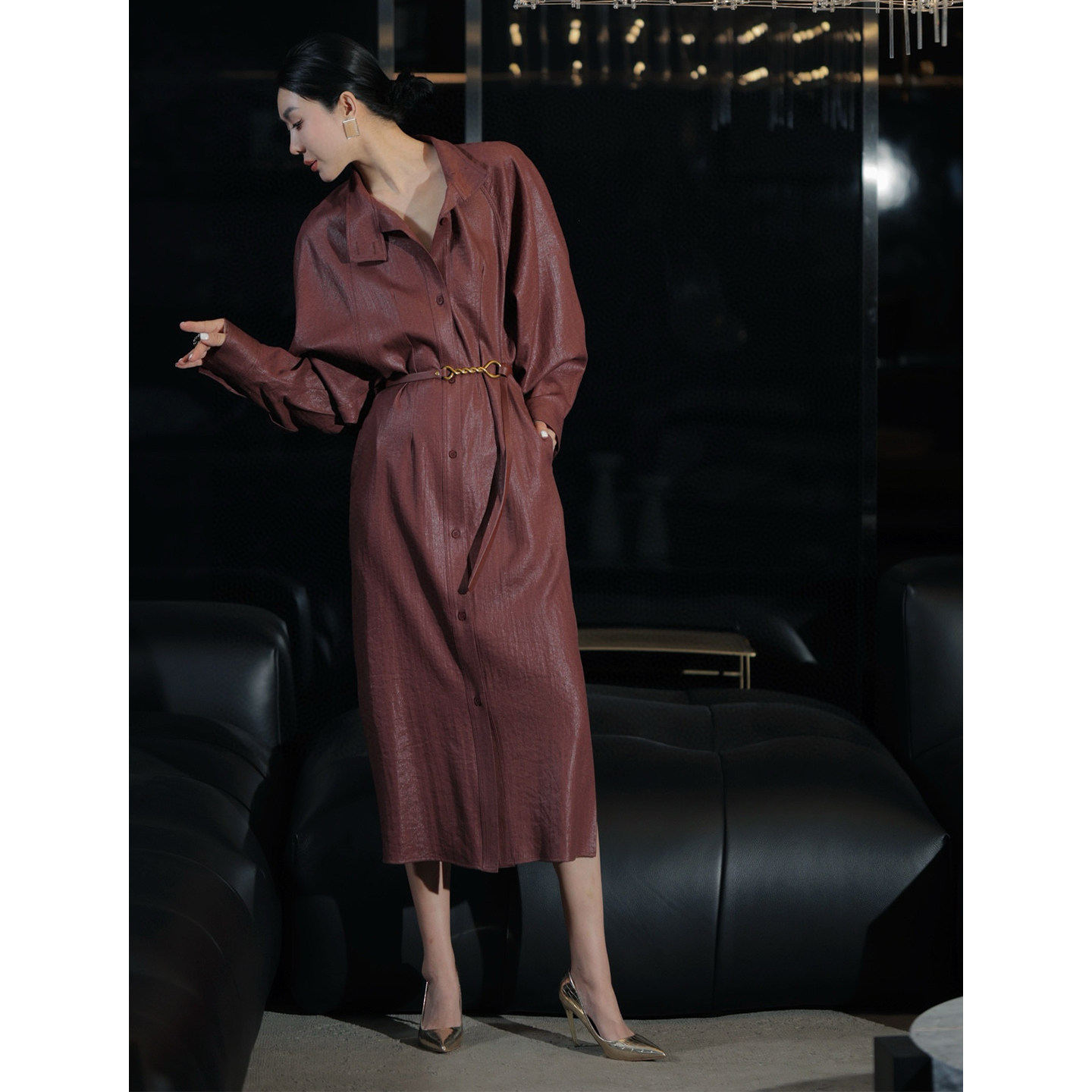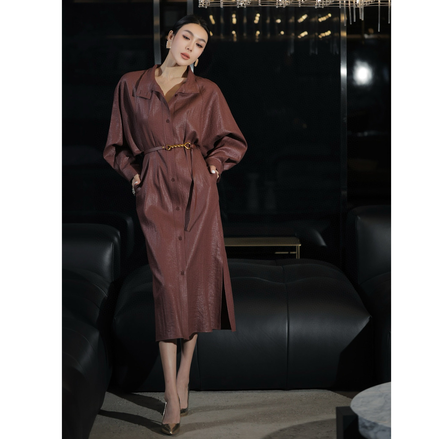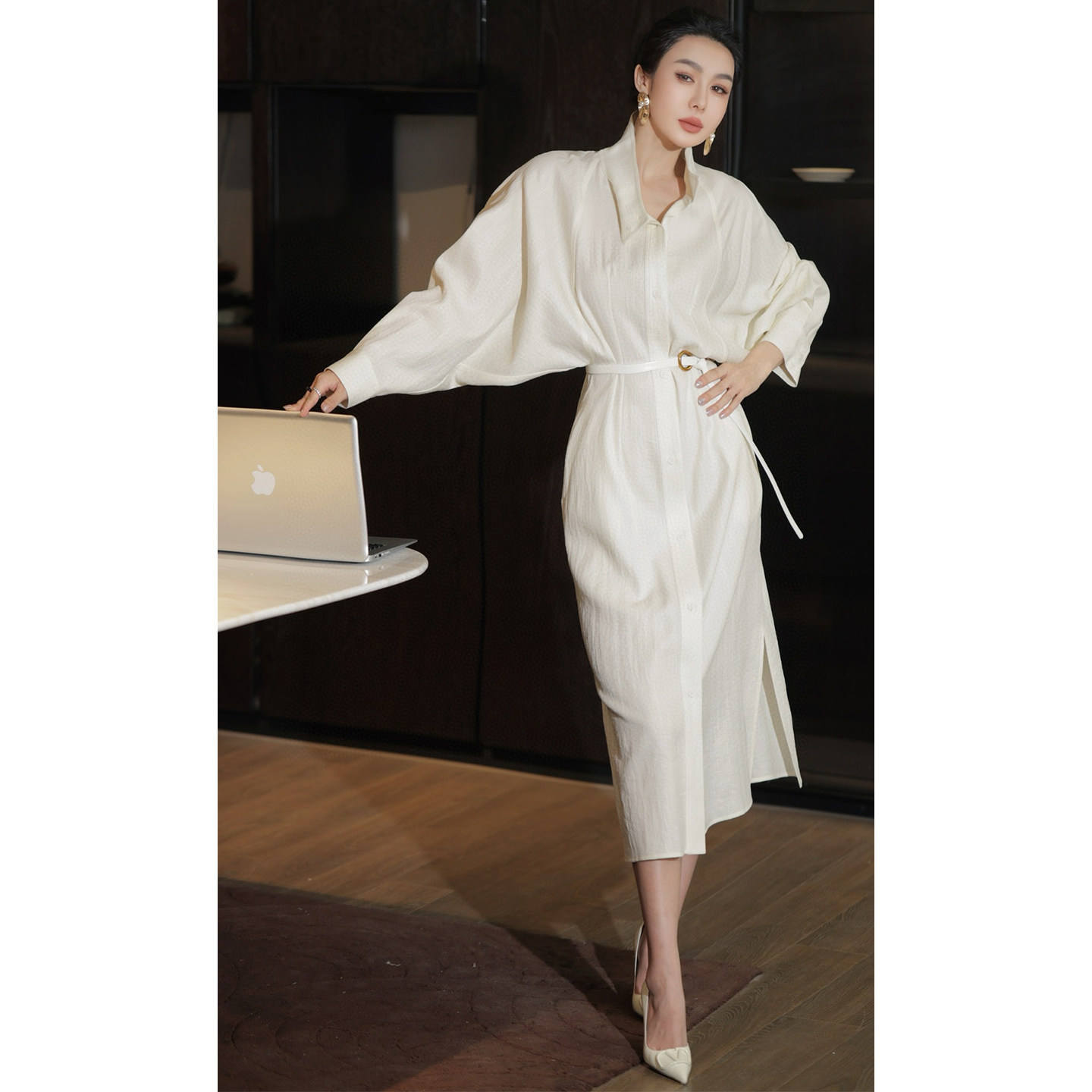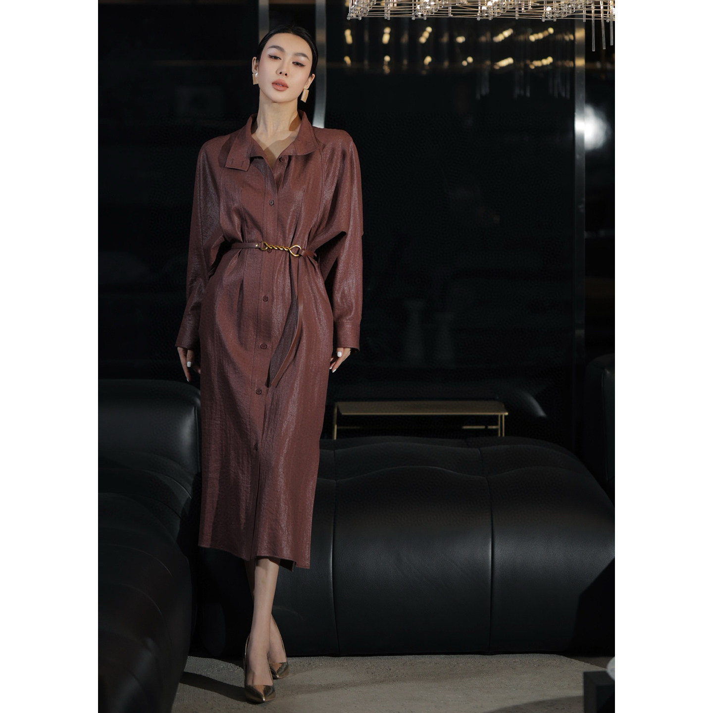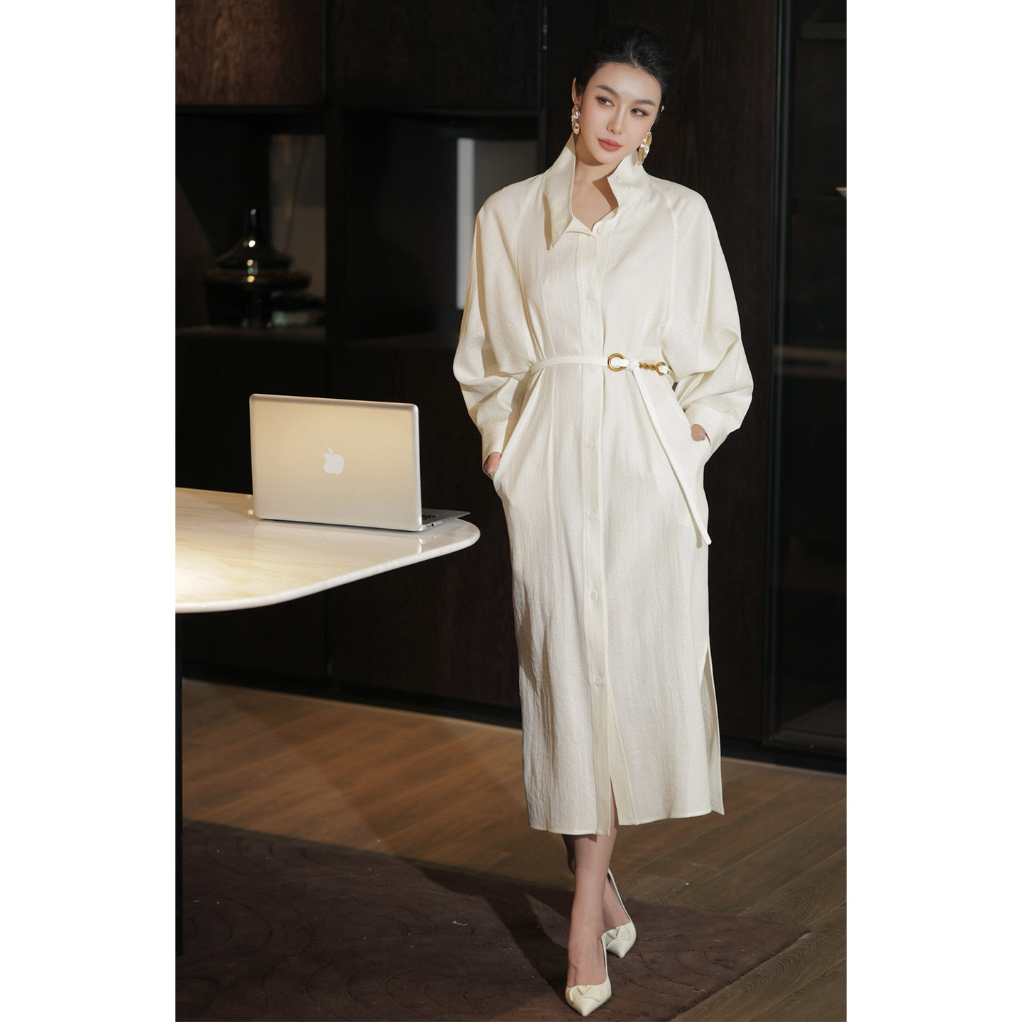 📚 简约老钱风立领衬衫风衣式连衣裙洋气蝙蝠袖系带收腰气质率性休闲