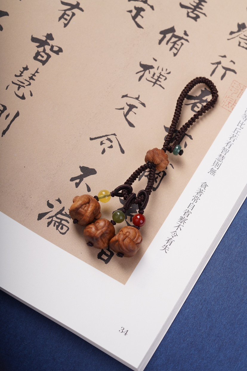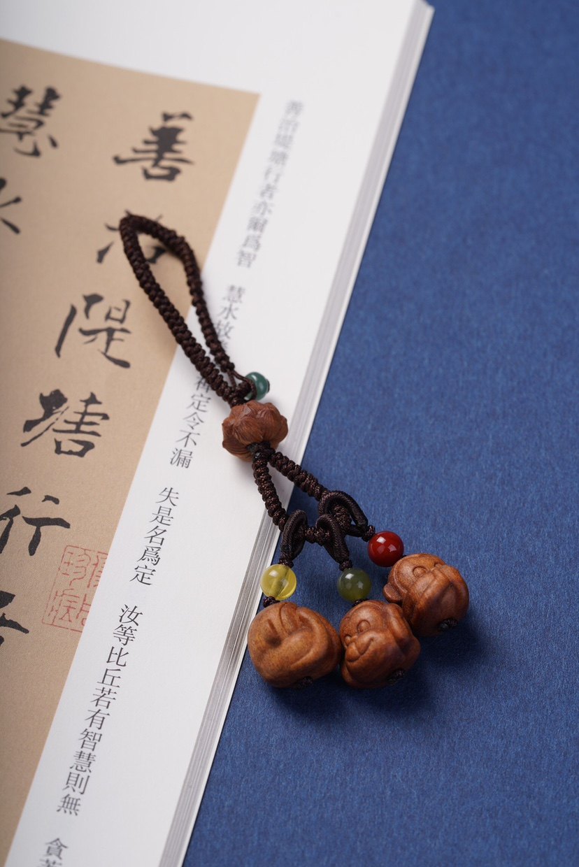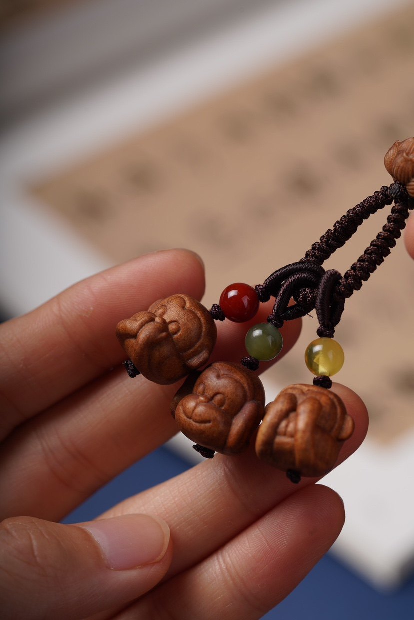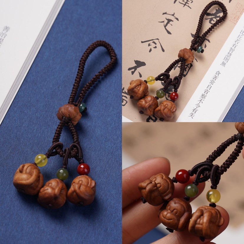 📚 印度老山檀香木雕三不猴车钥匙扣猴子包包挂件搭配南红蜜蜡翡翠
