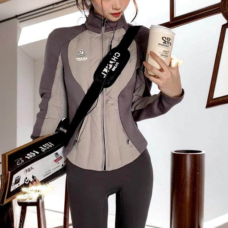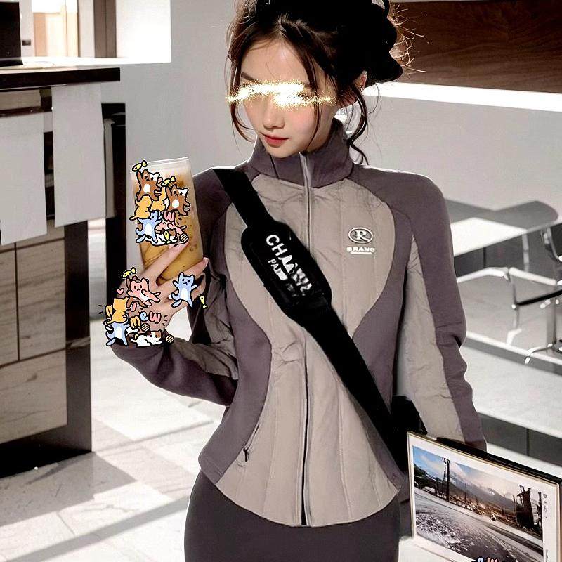 📚 地球店灰色拼接收腰轻薄羽绒服女秋冬短款修身显瘦小众设计感外套
