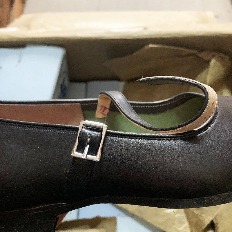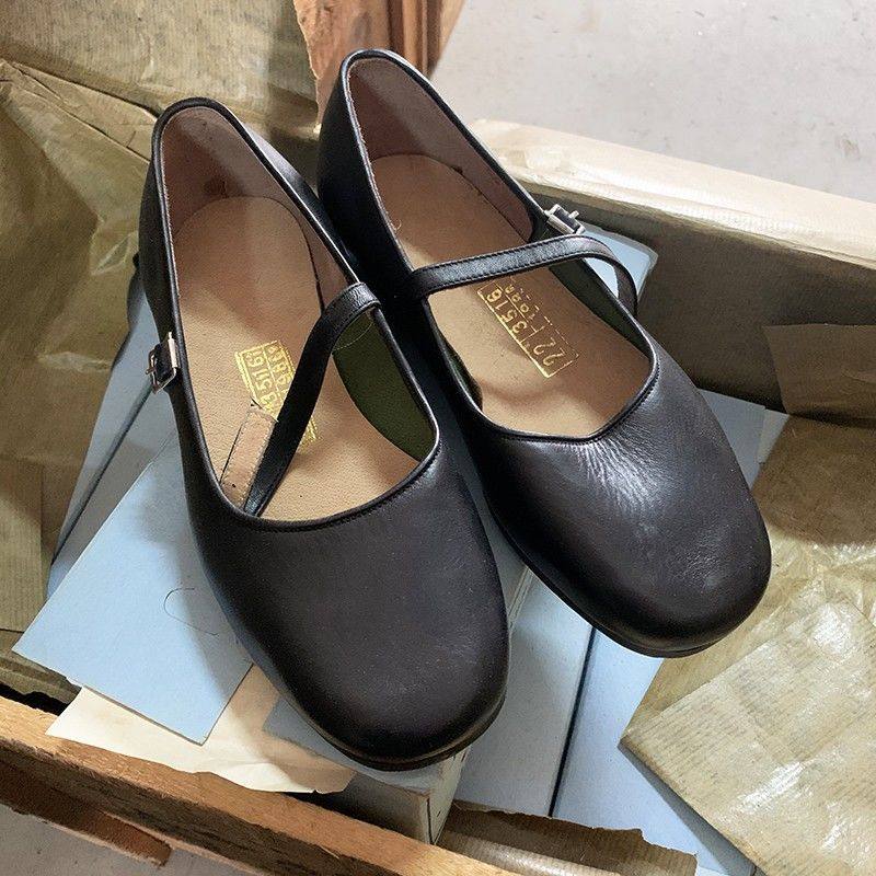 📚 复古女元口低腰皮鞋圆口夏季浅口蓝盒头层牛皮搭扣平底单鞋