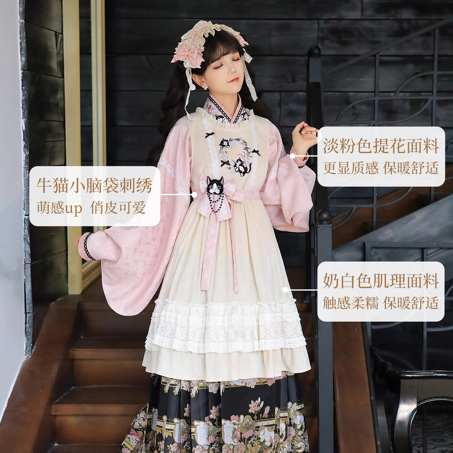 📚 汉尚华莲改良明制交领汉服女[奶牛小猫]国风刺绣汉洋折衷罩裙套装