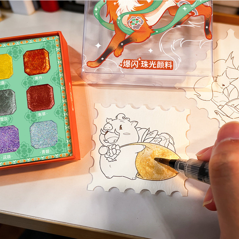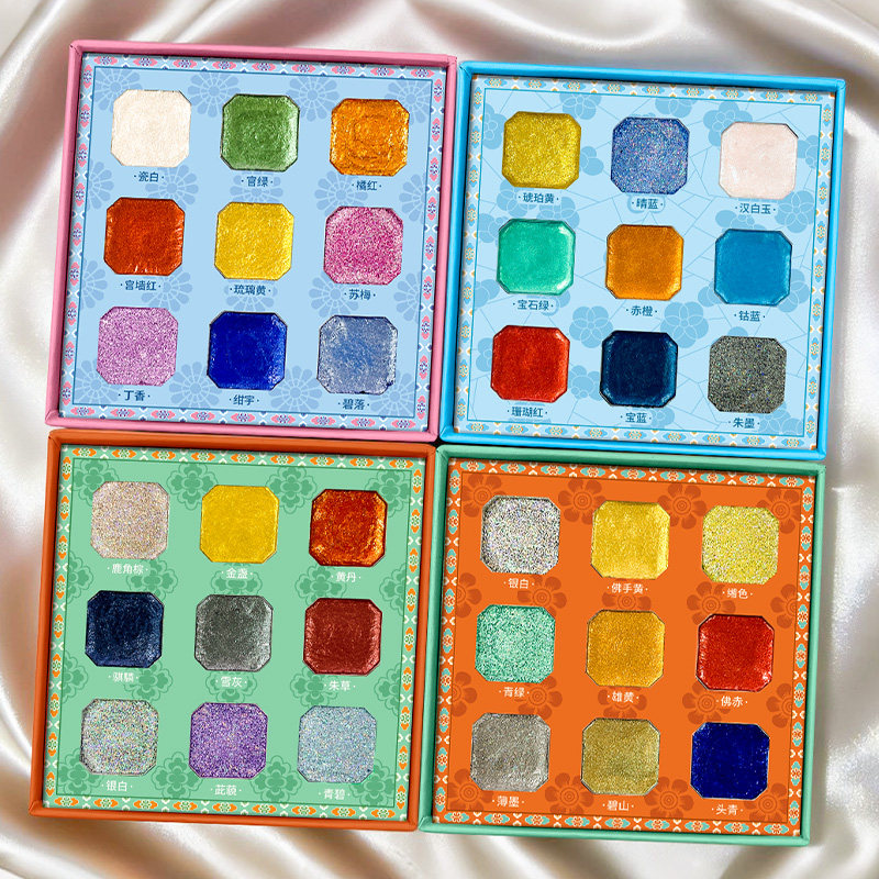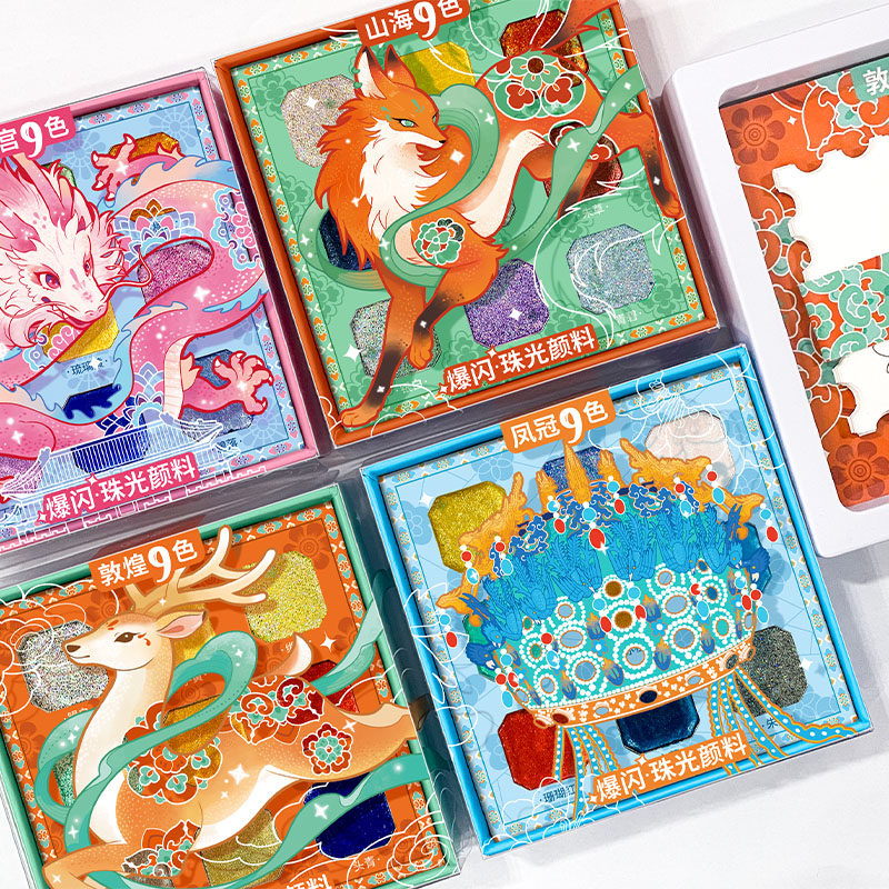 📚 飞乐鸟敦煌故宫9色国风迷你爆闪珠光水彩固体颜料盒套装画画涂色
