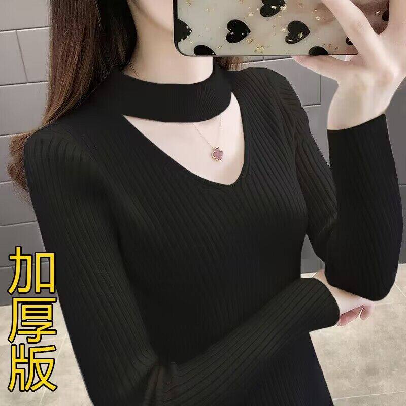 📚 2023春秋新款黑色内搭半高V领镂空针织打底衫毛衣女士挂脖上衣女