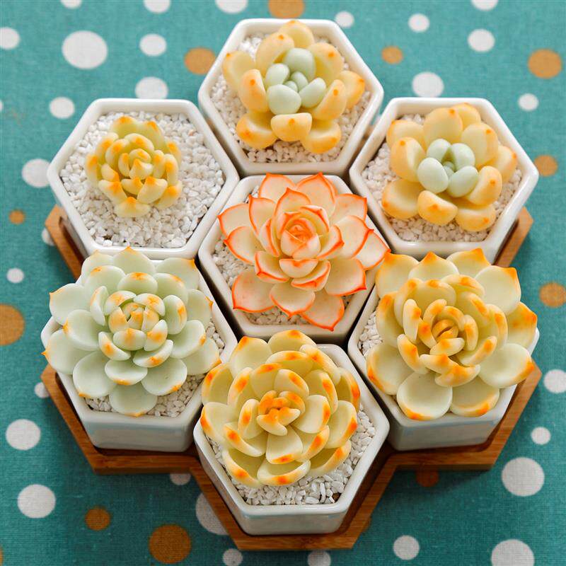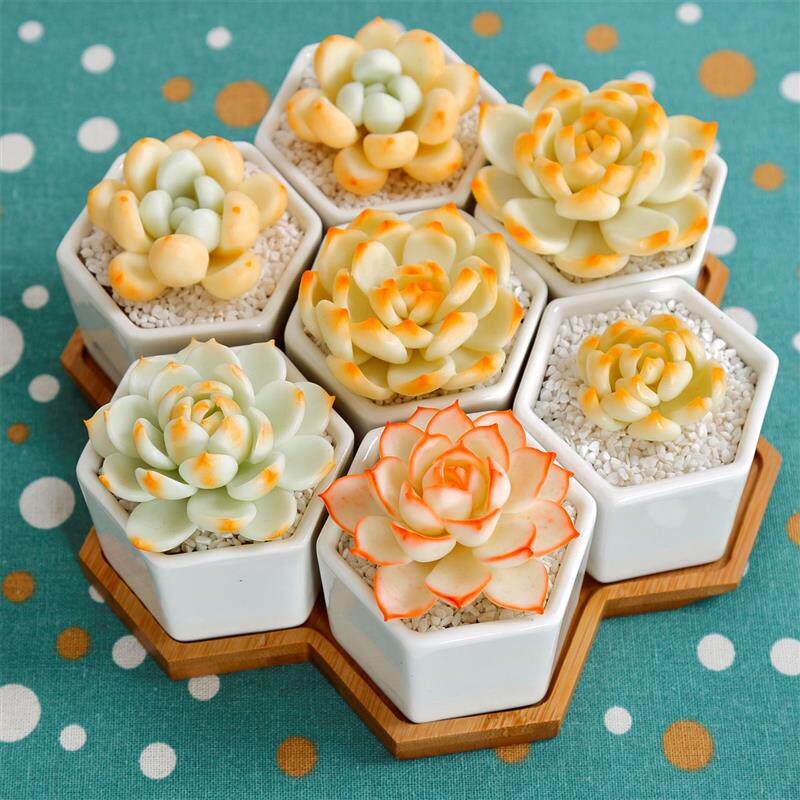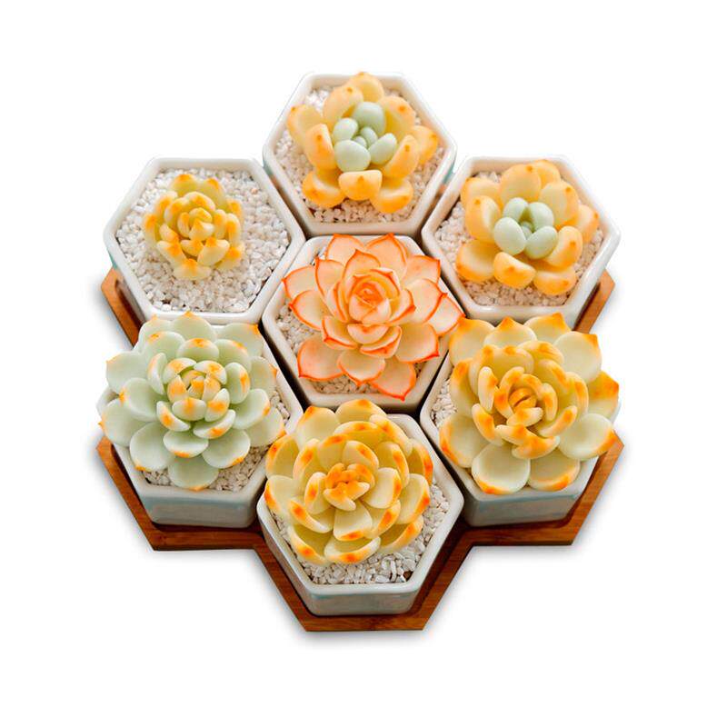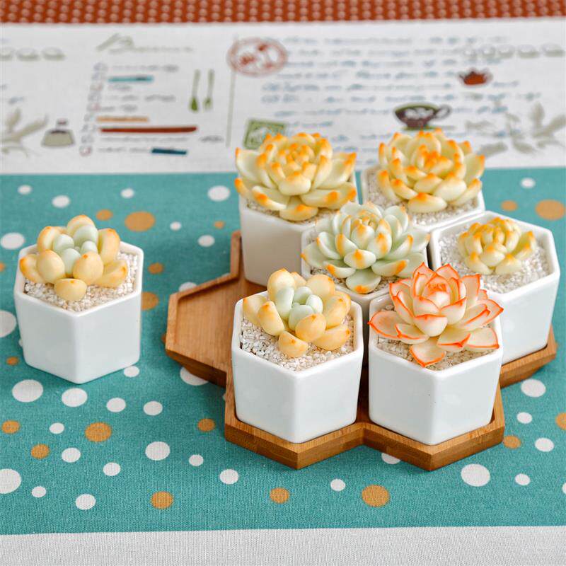 📚 简约白色创意陶瓷小六边六角形多肉花盆套七配竹托盘组合套装