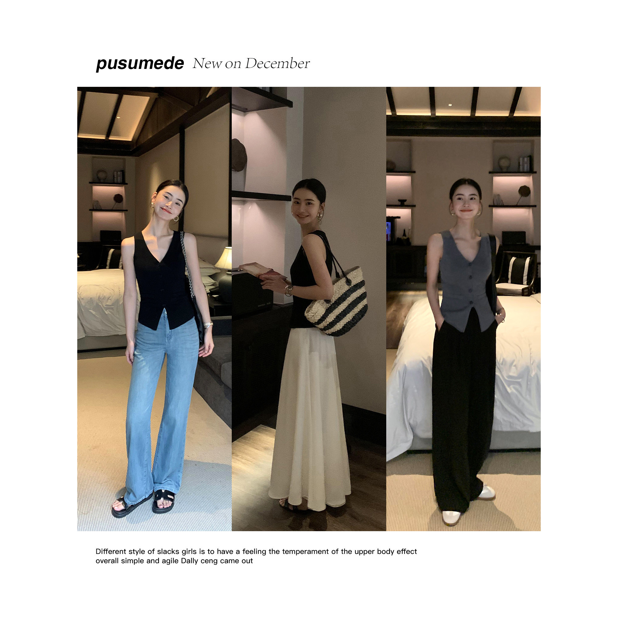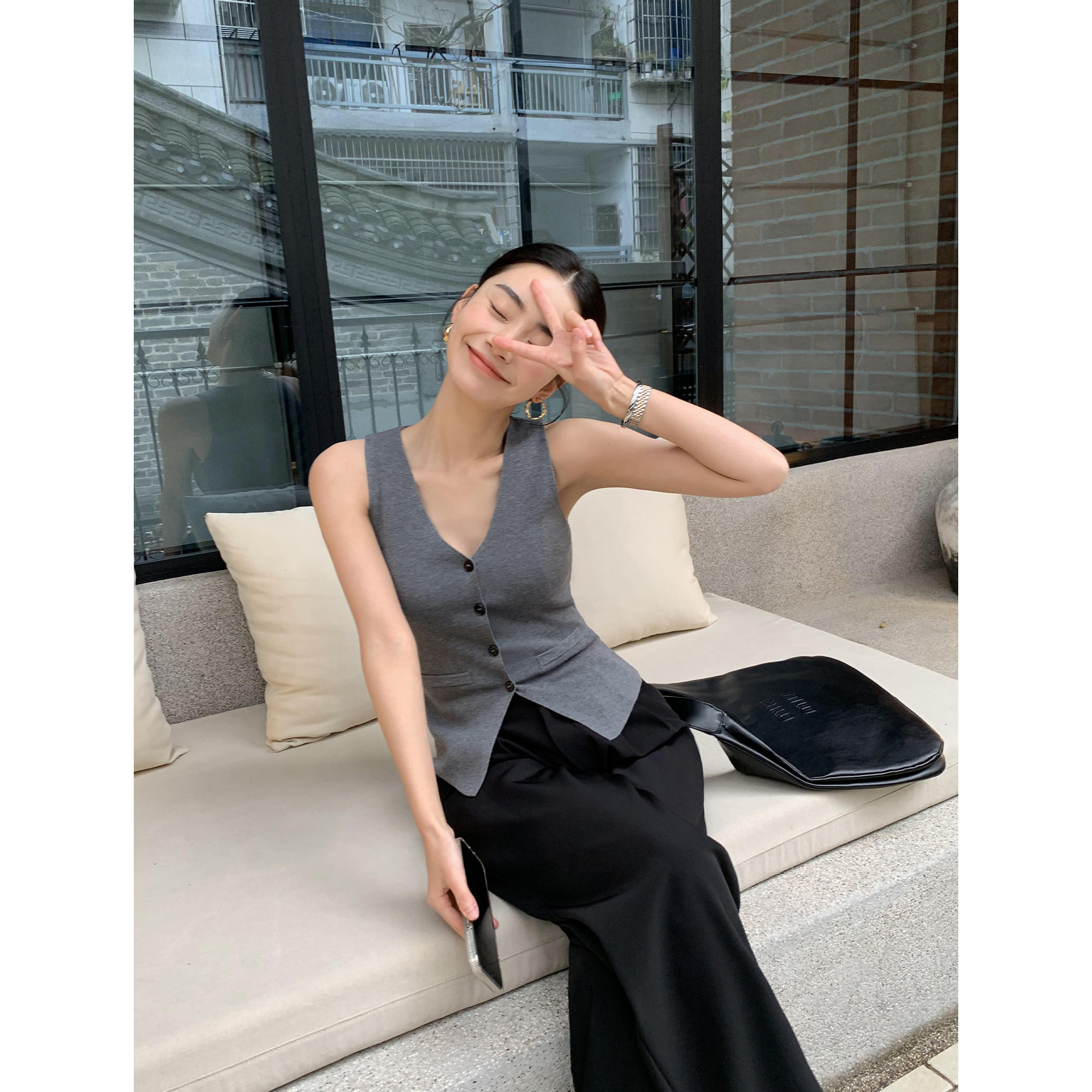 📚 pusumede 灰色复古v领针织马甲女开衫高级感坎肩无袖修身背心上衣