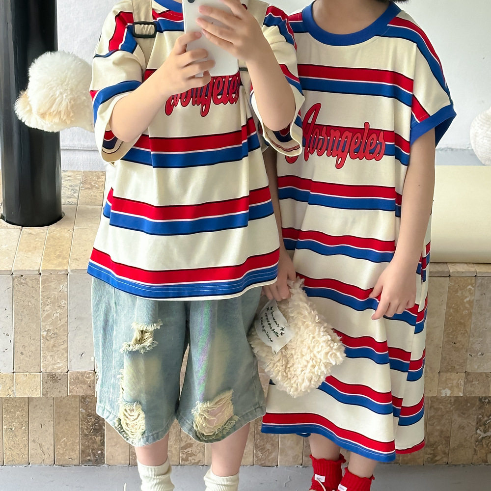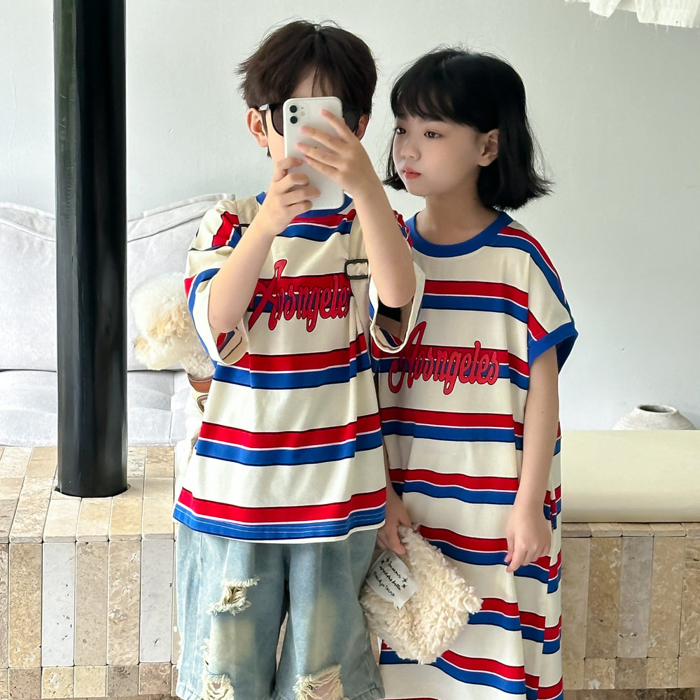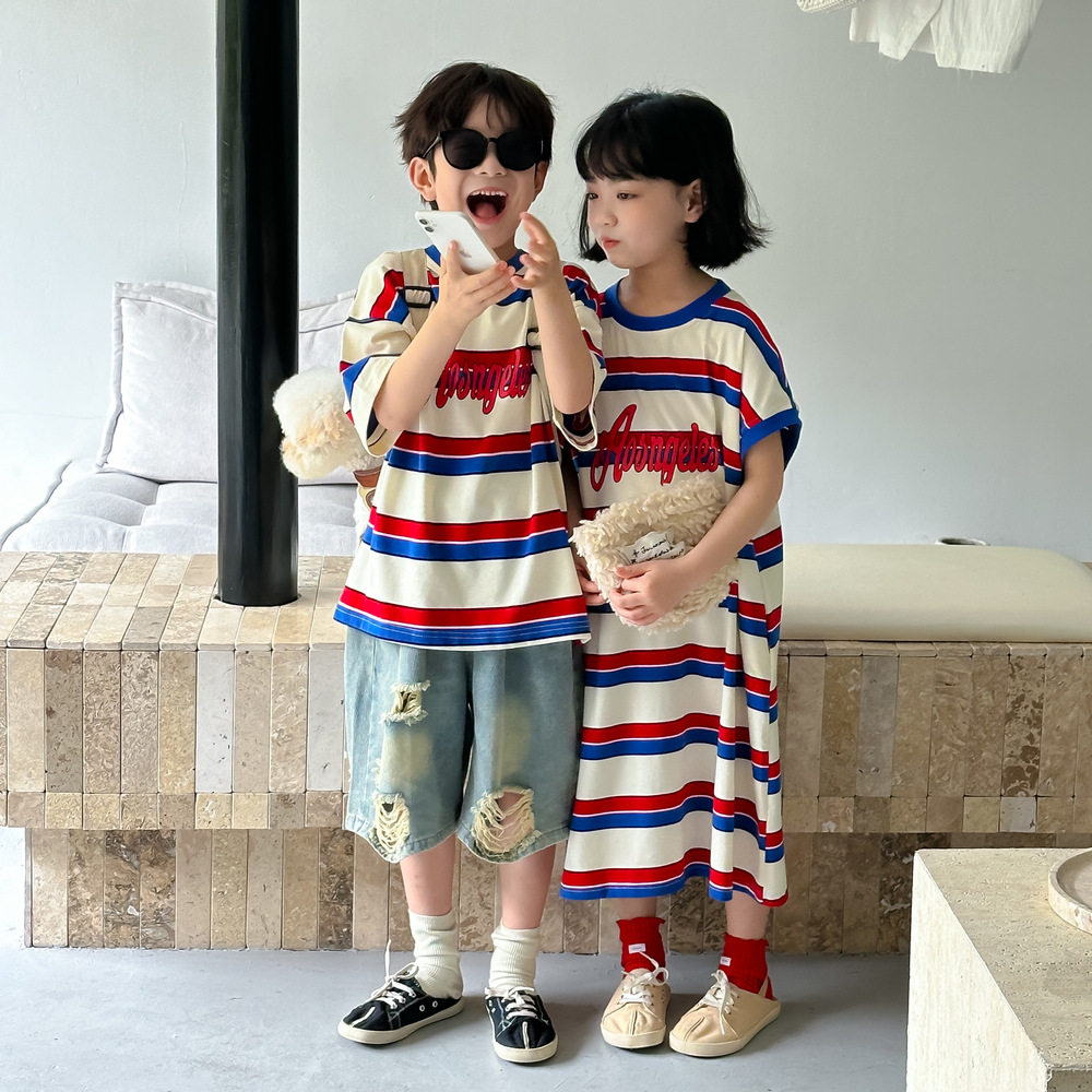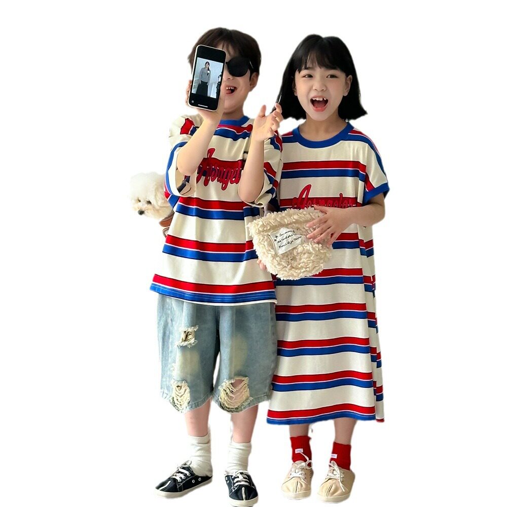 📚 童T恤2026夏男童女童韩版彩色条纹短袖儿童圆领中长款宽松卫衣裙