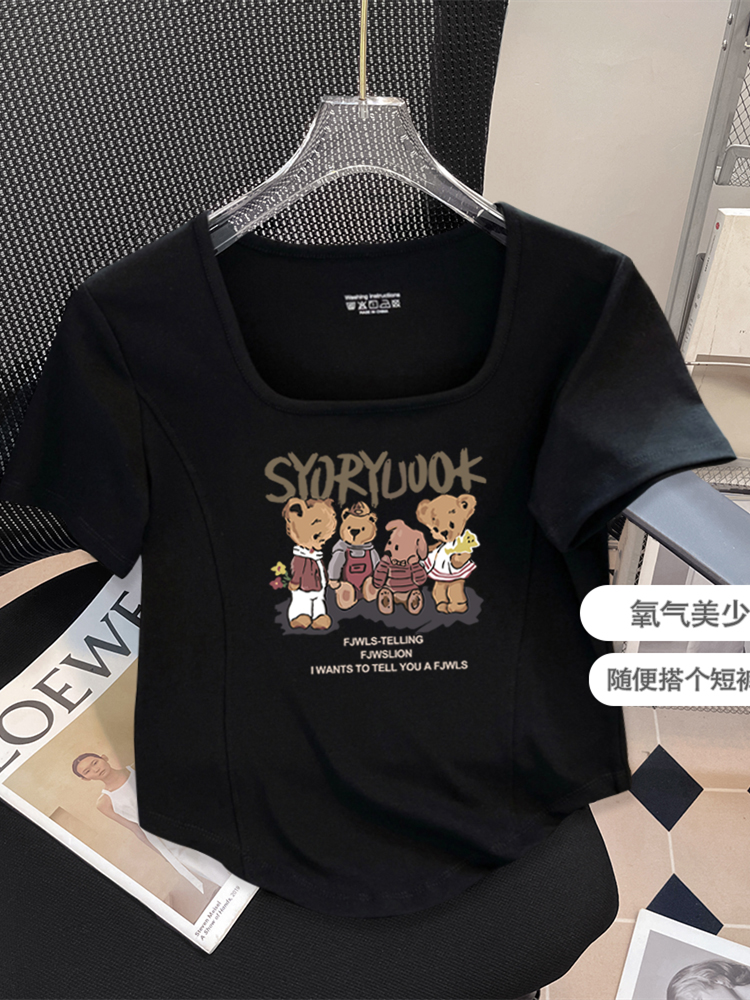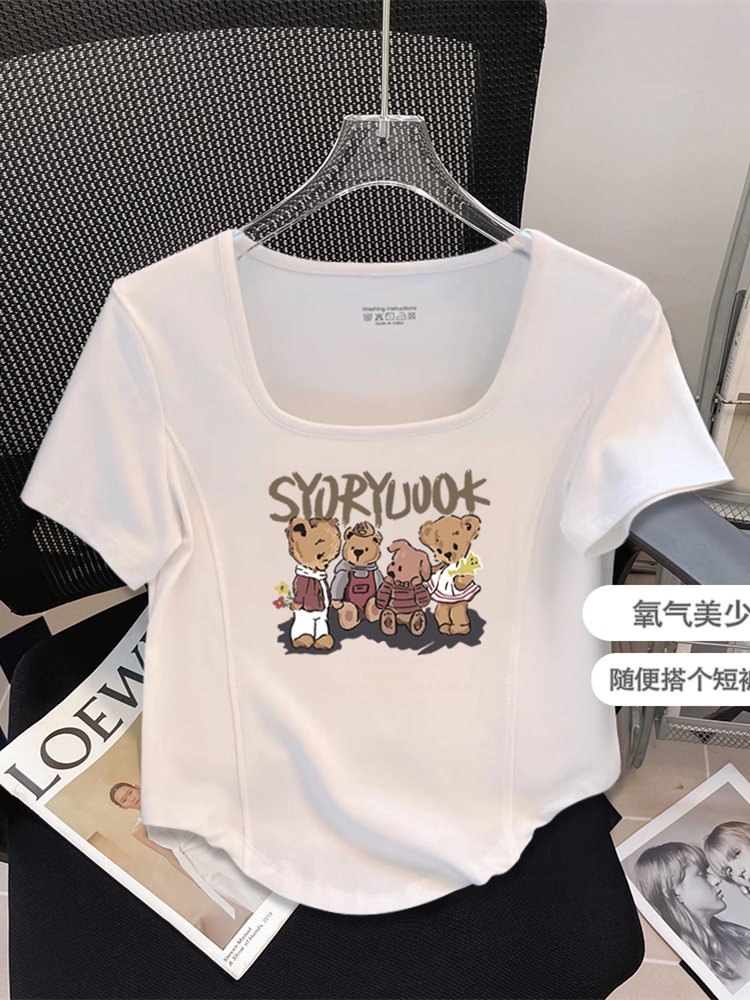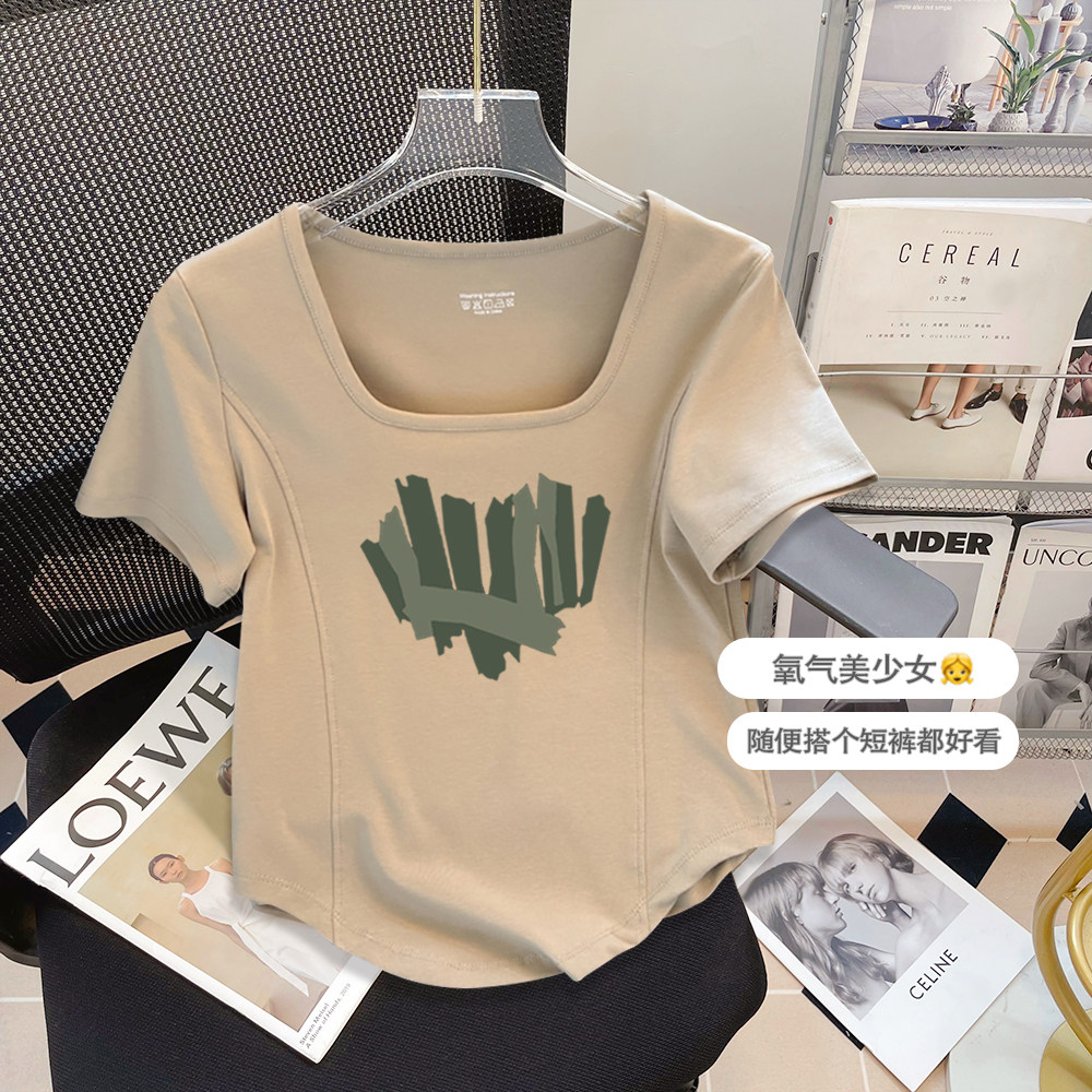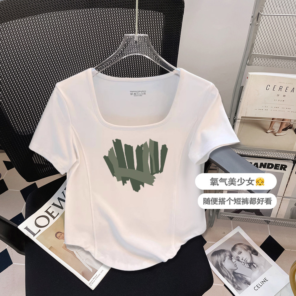 📚 百搭正肩弧形下摆短袖t恤女夏季方领辣妹修身显瘦高腰短款上衣ins
