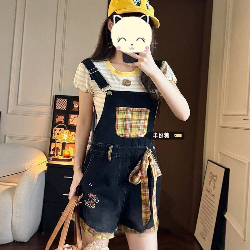 📚 复古甜辣黑色拼接牛仔背带收腰背带裤女学生百搭条纹上衣两件套装