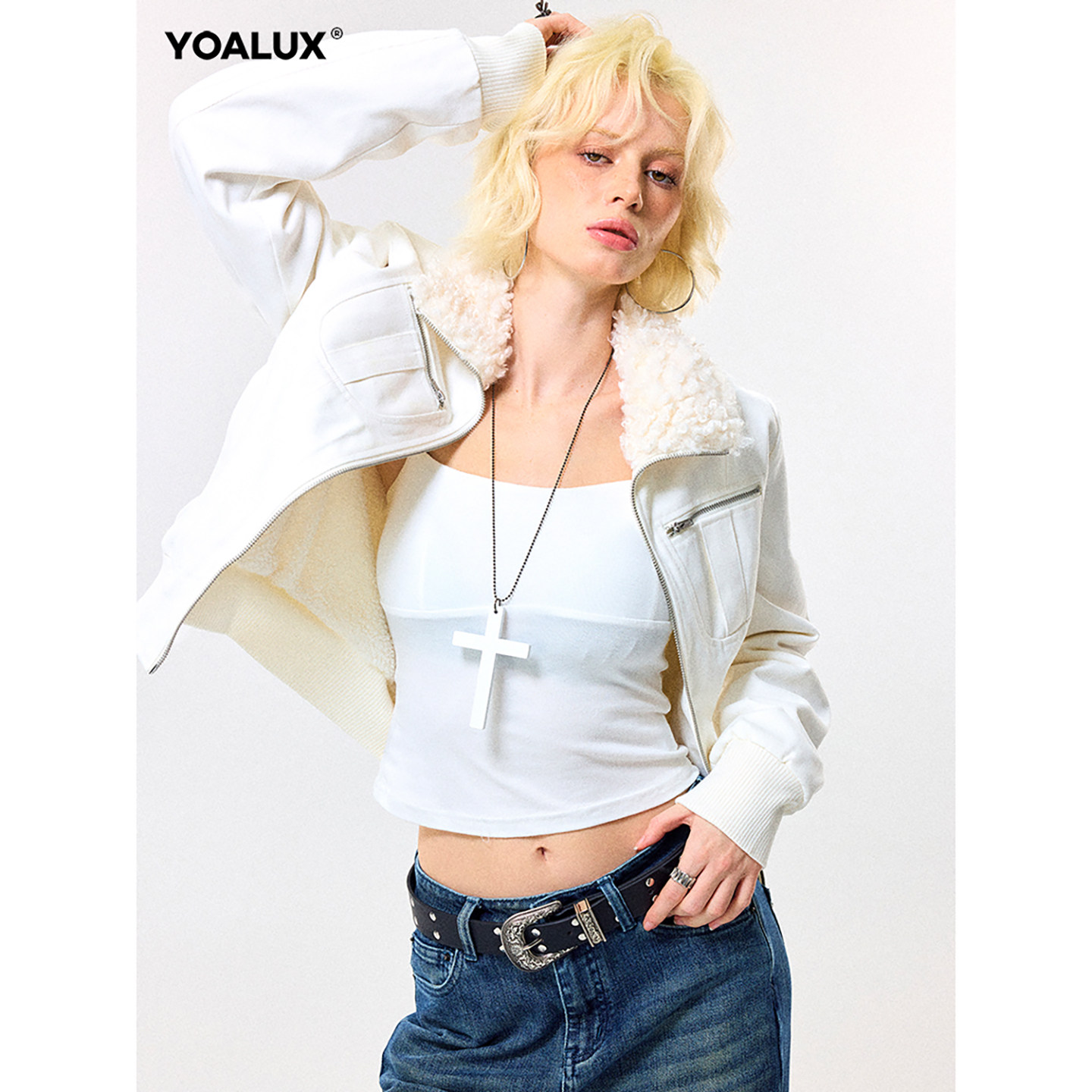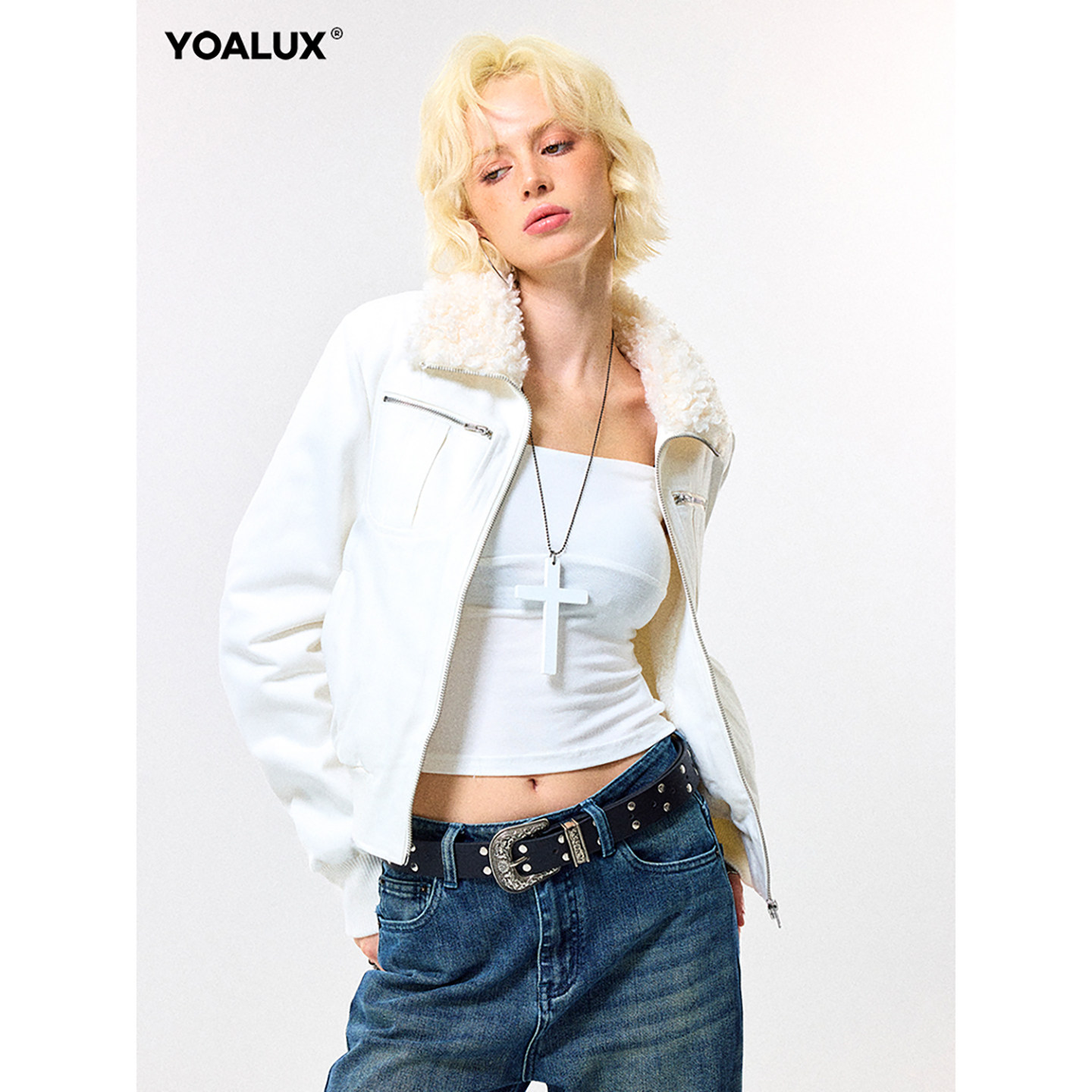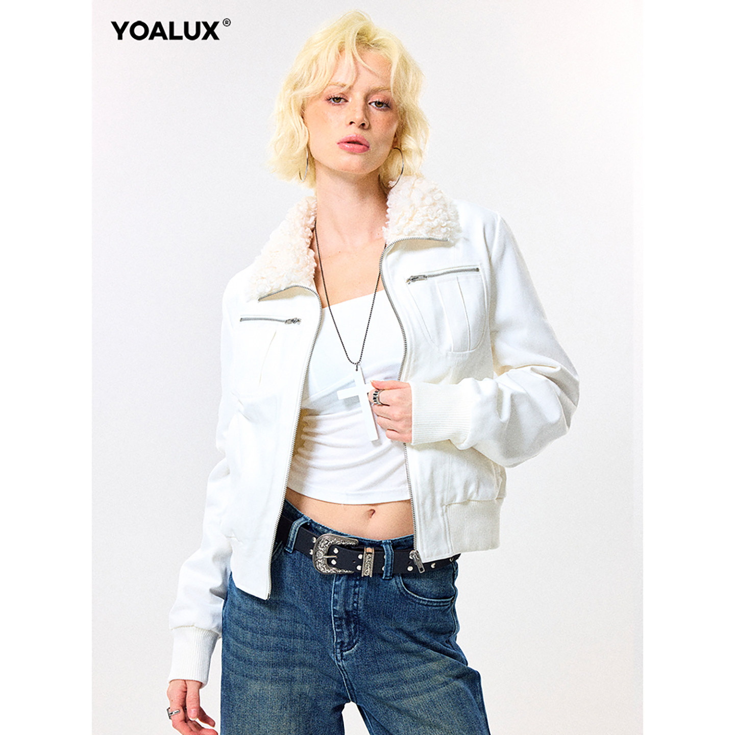 📚 YOALUX冬季时髦毛绒翻领外套女正肩保暖短款拉链休闲工装夹克外套