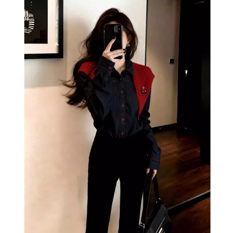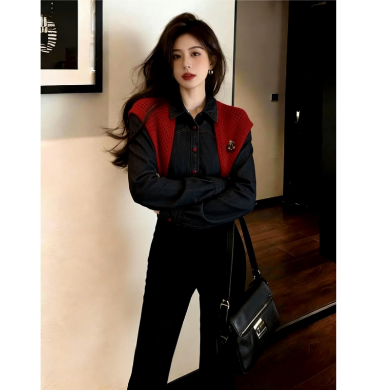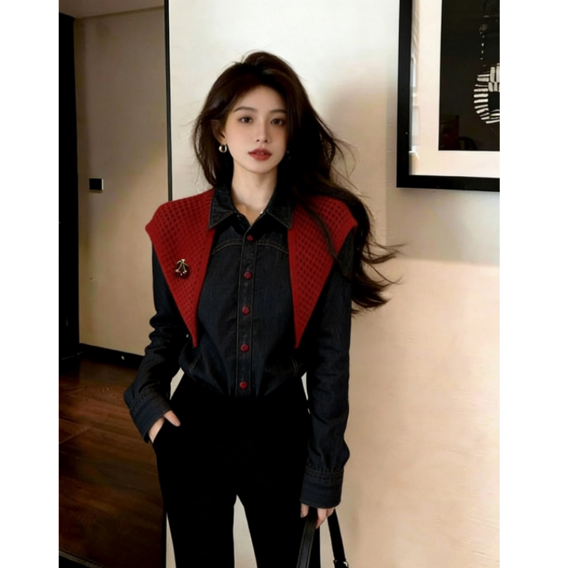 📚 复古牛仔衬衫樱桃披肩两件套衬衫女2026春新款设计感宽松叠穿外套
