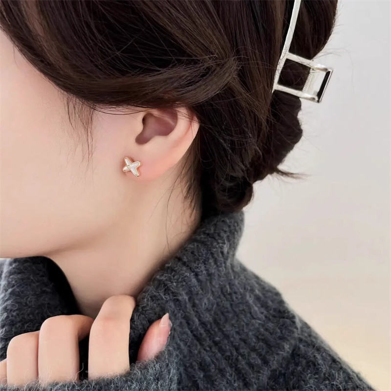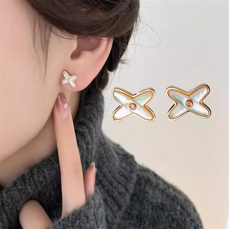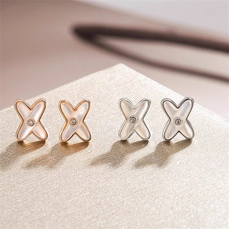 📚 轻奢俞大生玫瑰金交叉白贝母耳钉女X型钻字母设计感气质百搭耳环