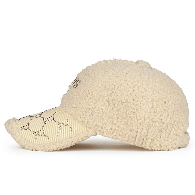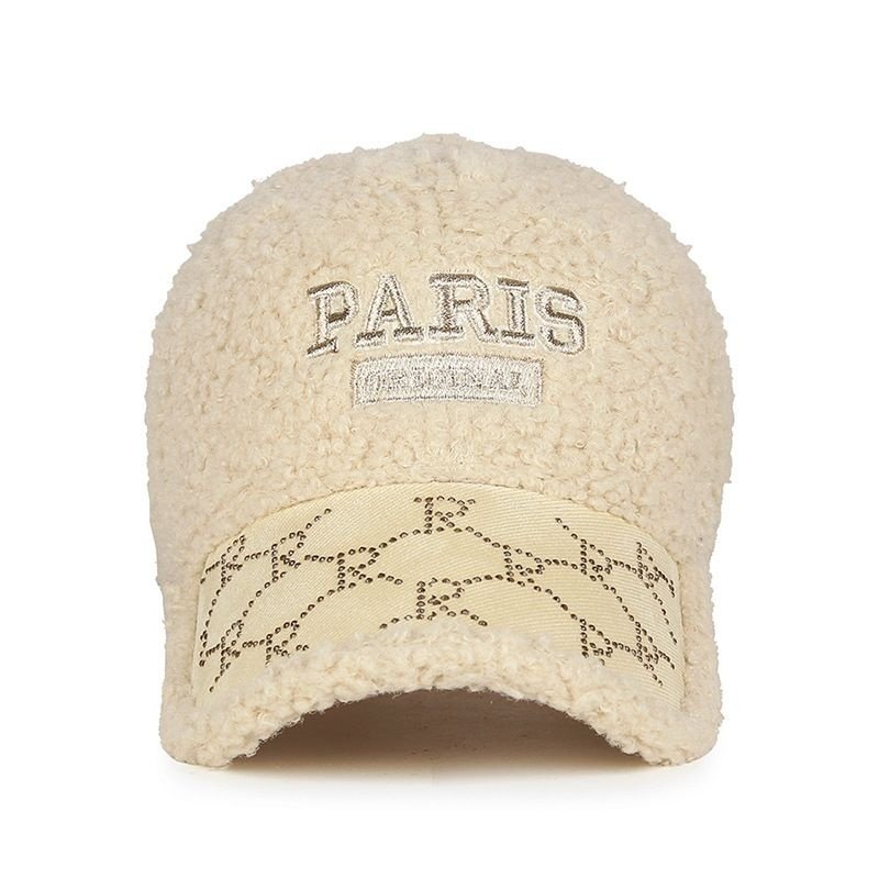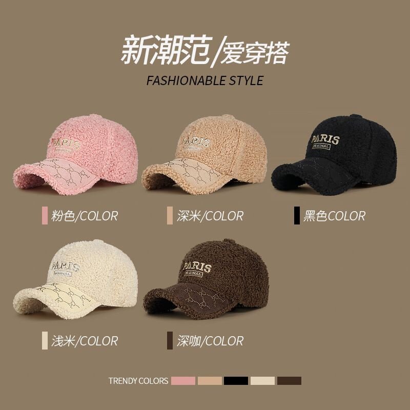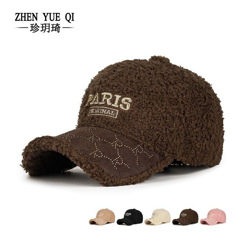 📚 秋冬季烫水钻金属线刺绣棒球帽子女士青年羊羔绒保暖显脸小鸭舌帽