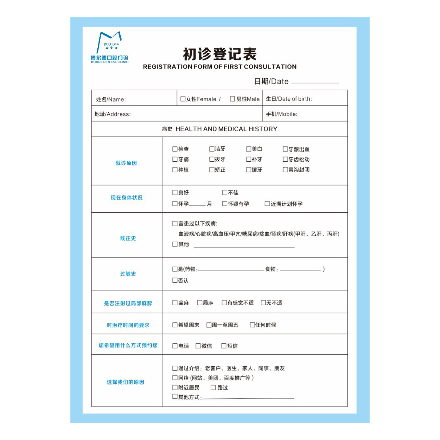 初诊口腔门诊牙科就诊登记表
