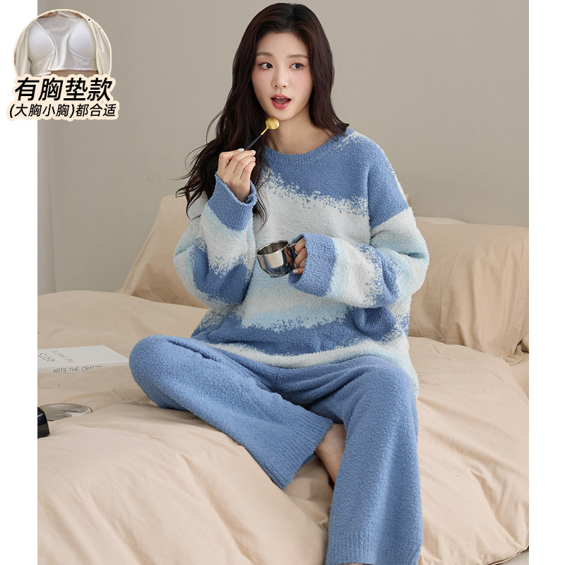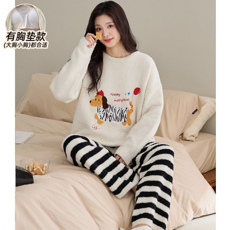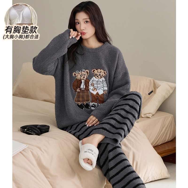 📚 高级感冬季睡衣女款珊瑚绒加厚米粒绒带胸垫2025新款防凸点居家服