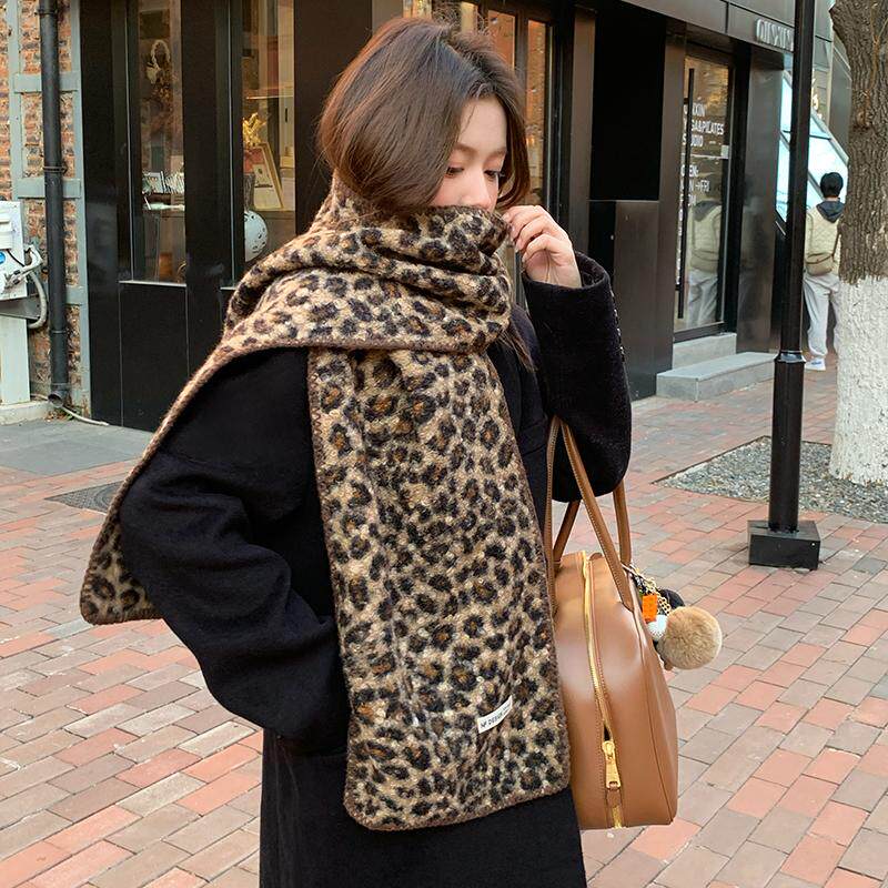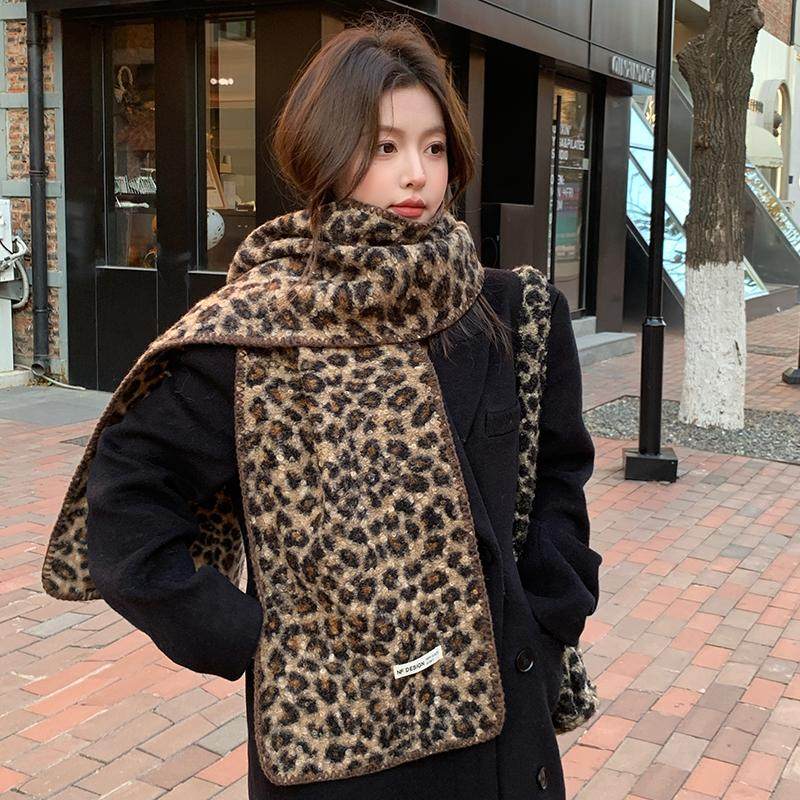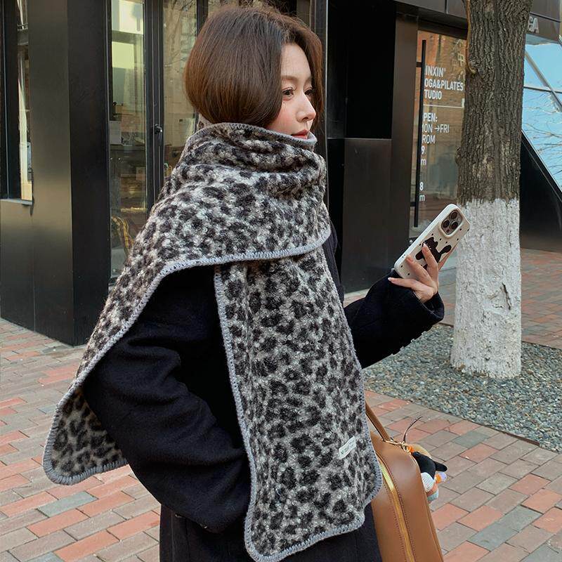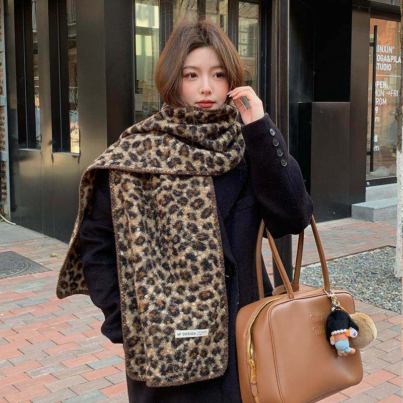 📚 韩系高级感豹纹针织围巾女2025秋冬季复古百搭加厚保暖毛绒围脖潮