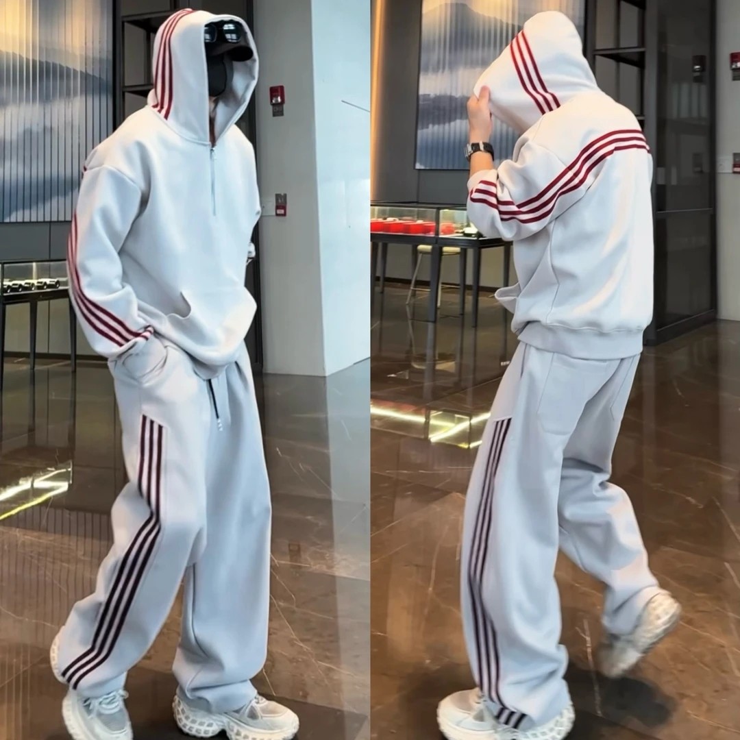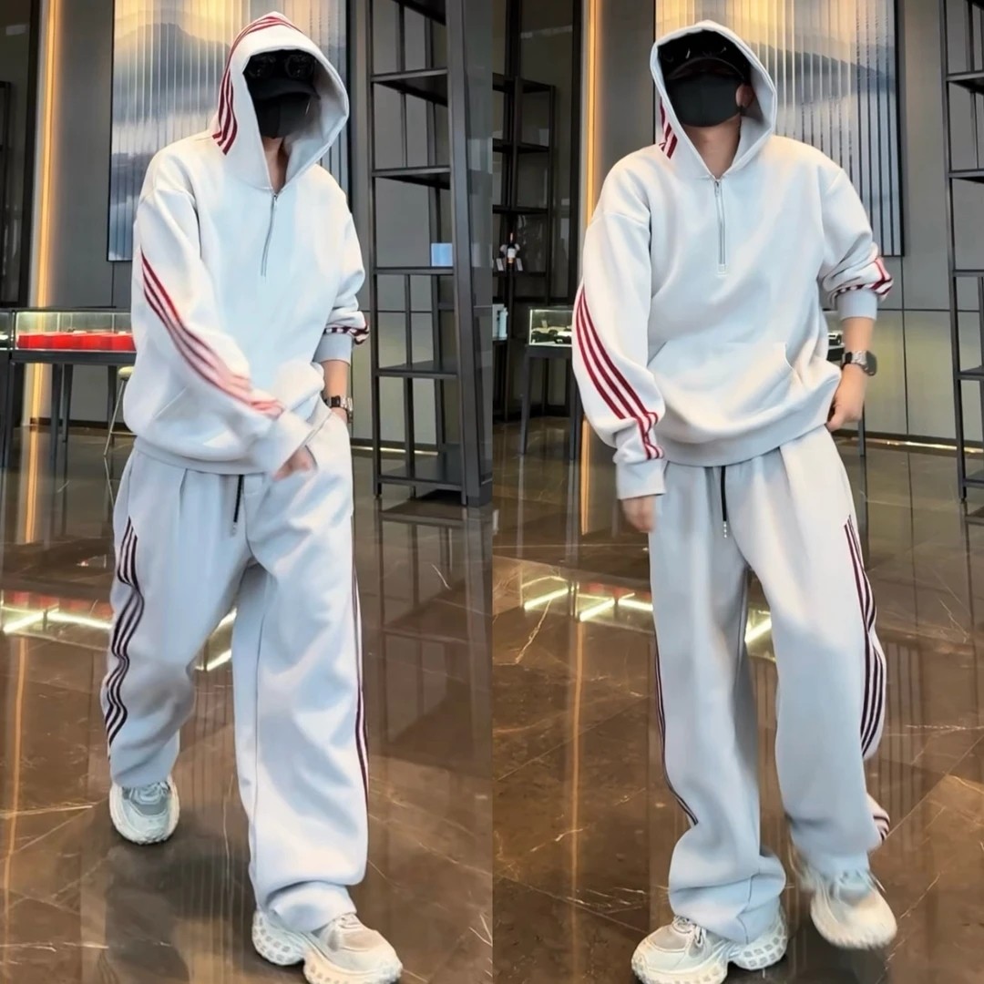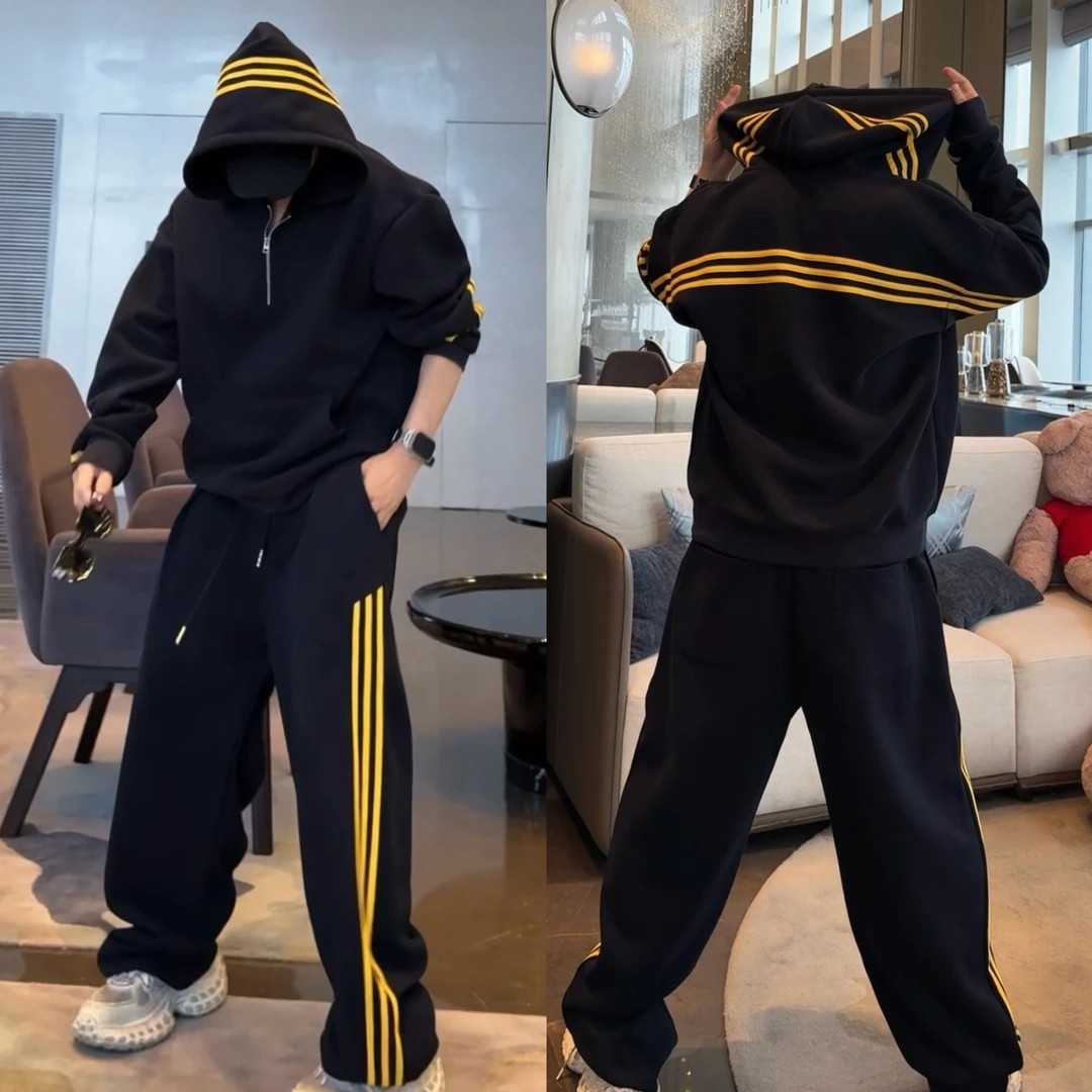 📚 秋冬半拉链经典三条杠连帽卫衣休闲套装情侣款潮流宽松卫裤两件套