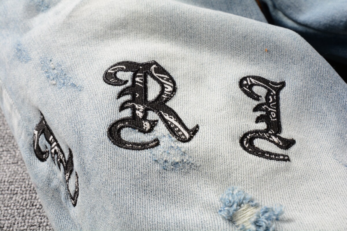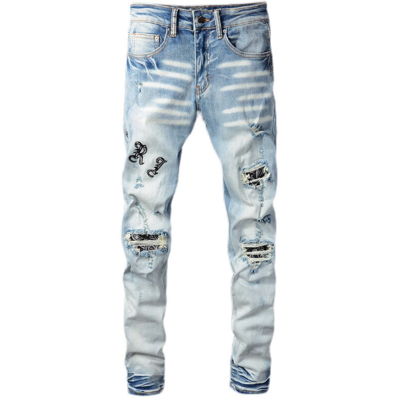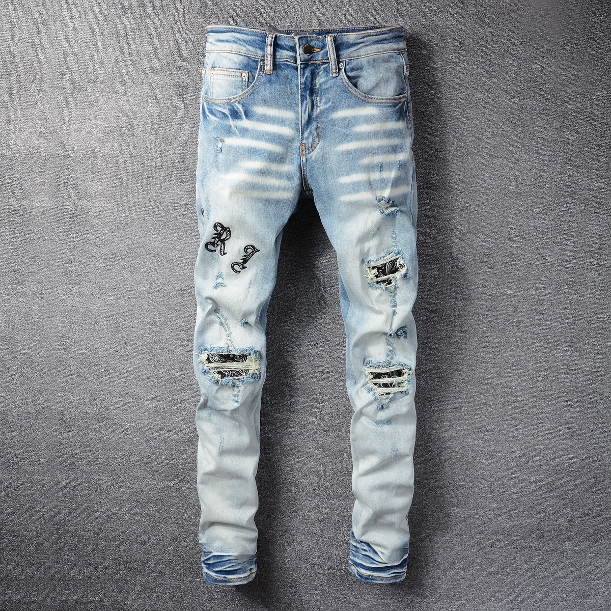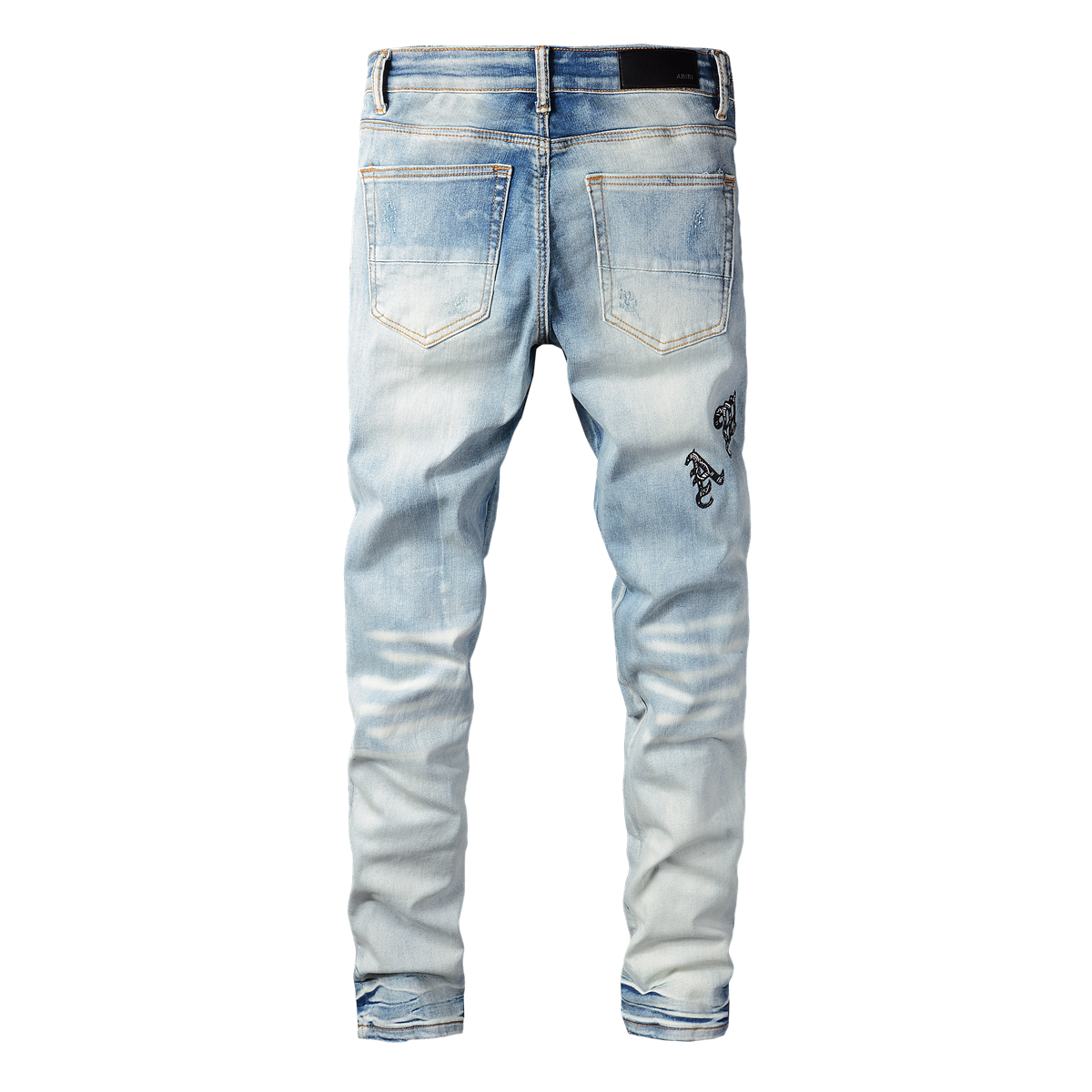 📚 AMR JEANS 美式高街潮牌浅色水洗LOGO刺绣腰果花补丁修身牛仔裤男