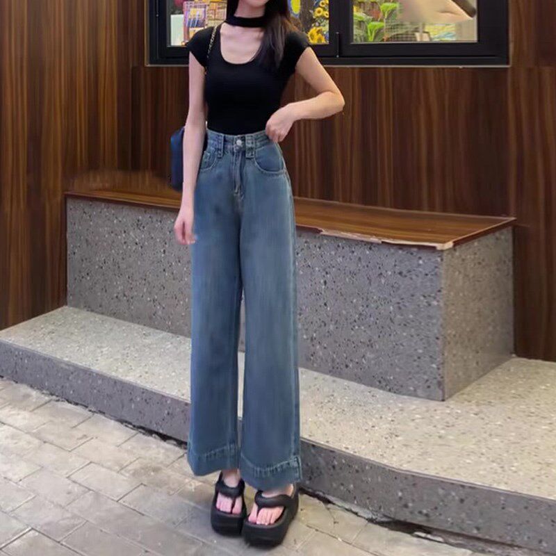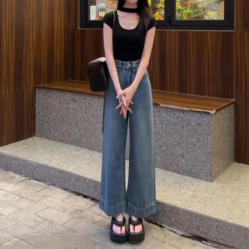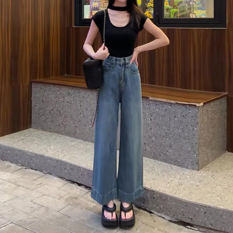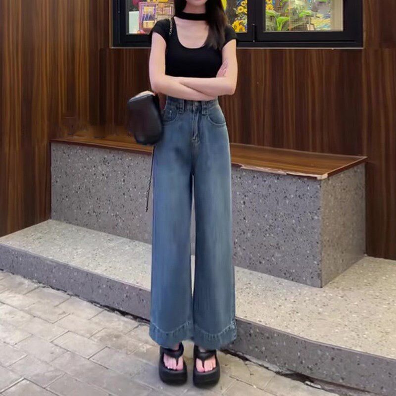 📚 速发复古阔款牛仔裤春九腿薄款2024新款高腰垂感宽松秋分裤