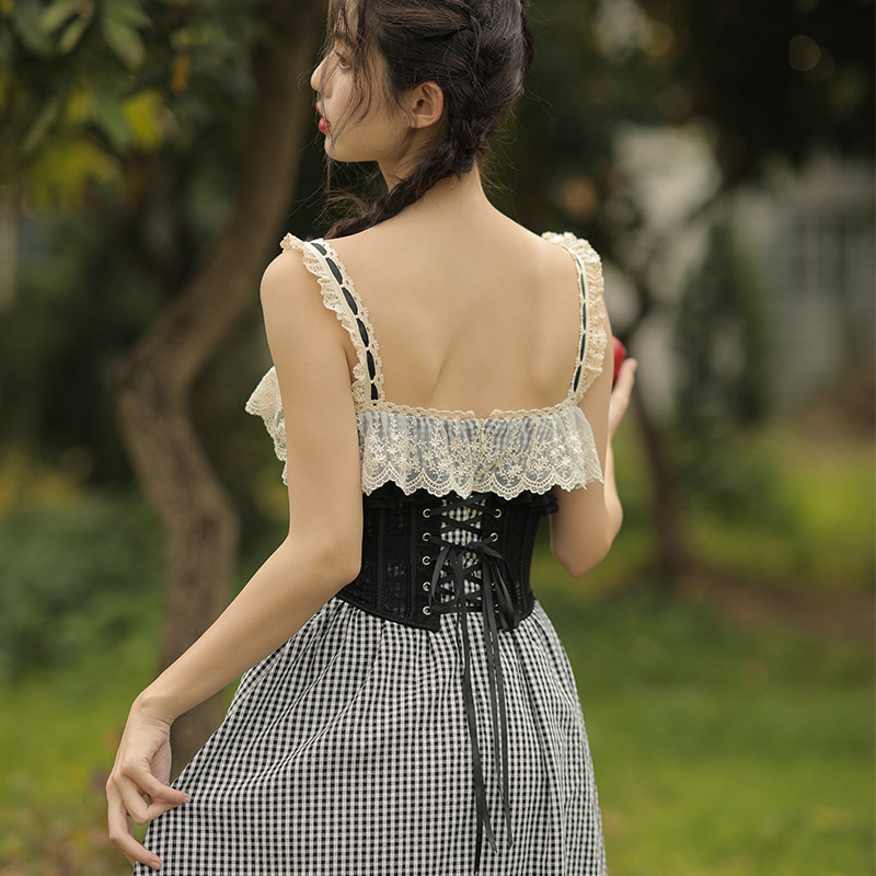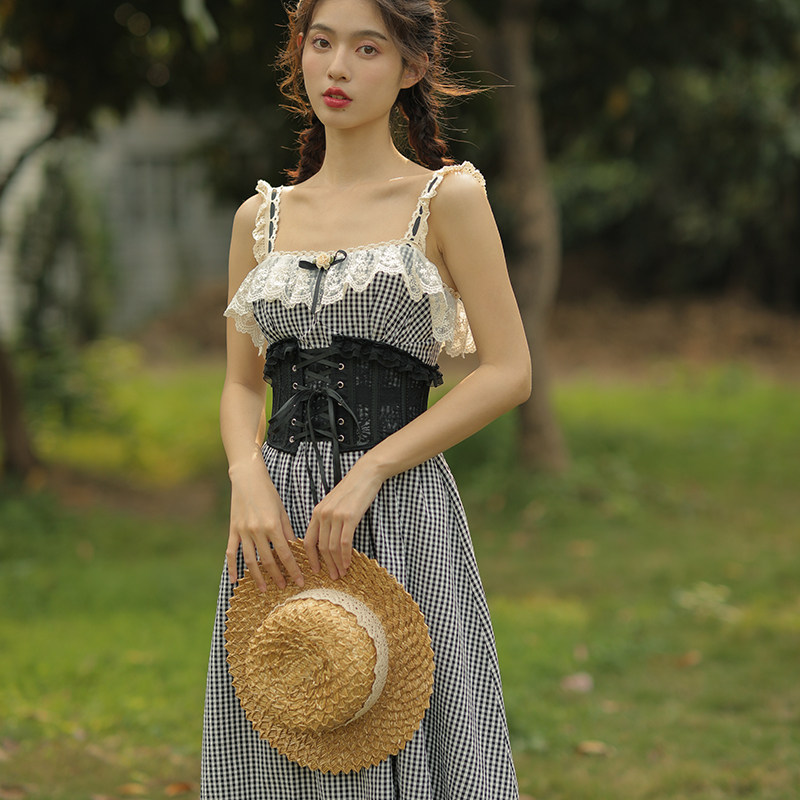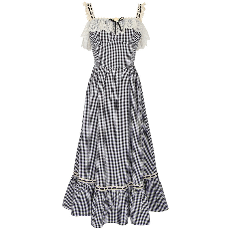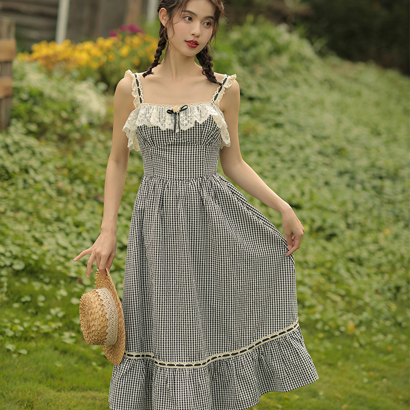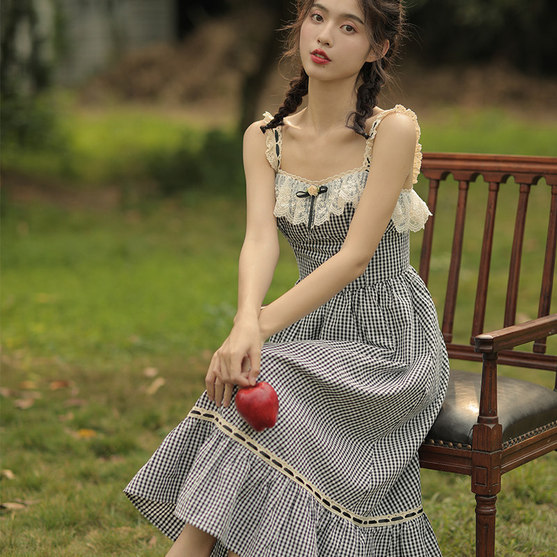 📚 奈良吊带连衣裙2025新款法式复古连身裙子女夏季蕾丝长裙收腰显瘦