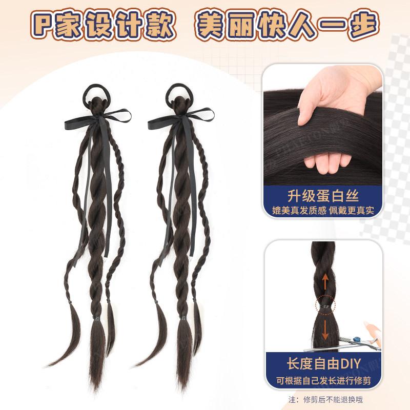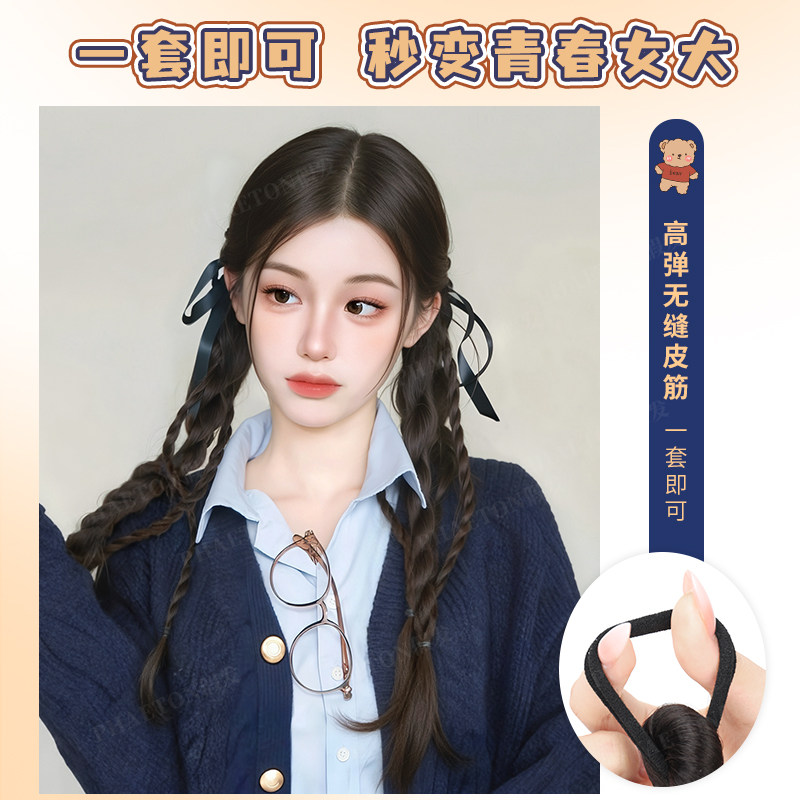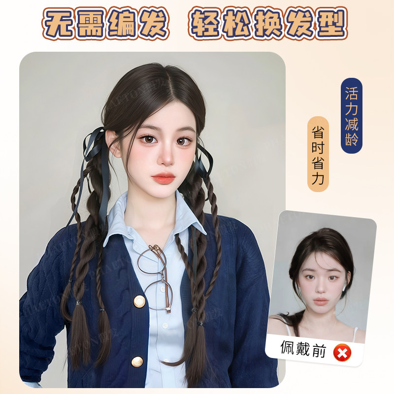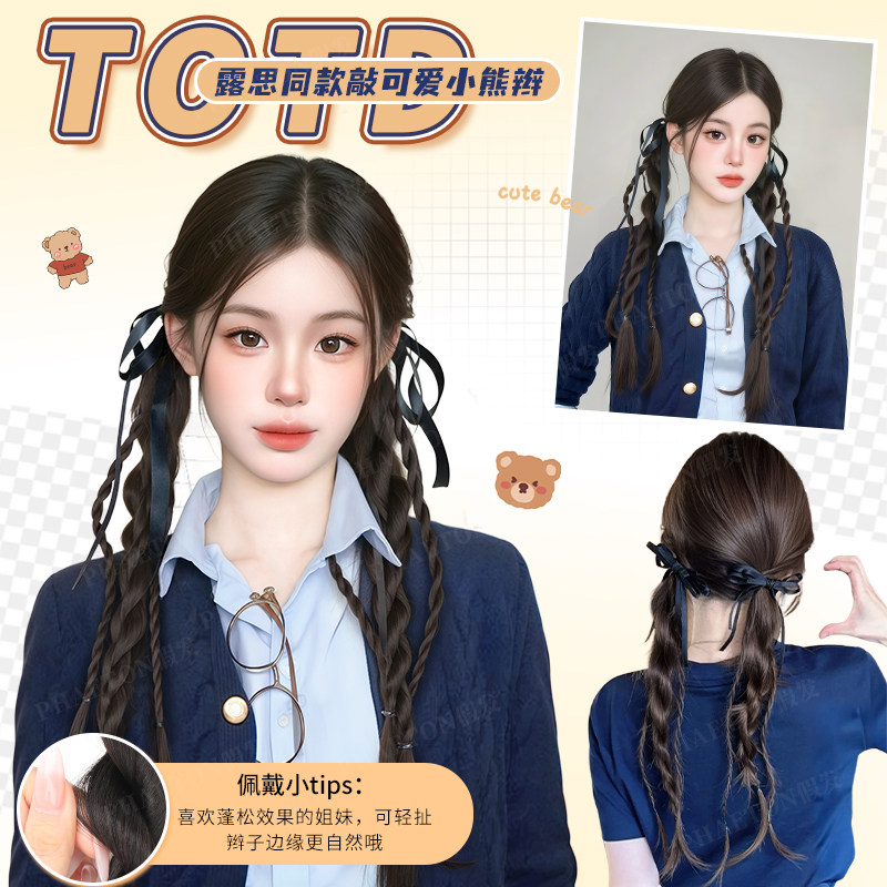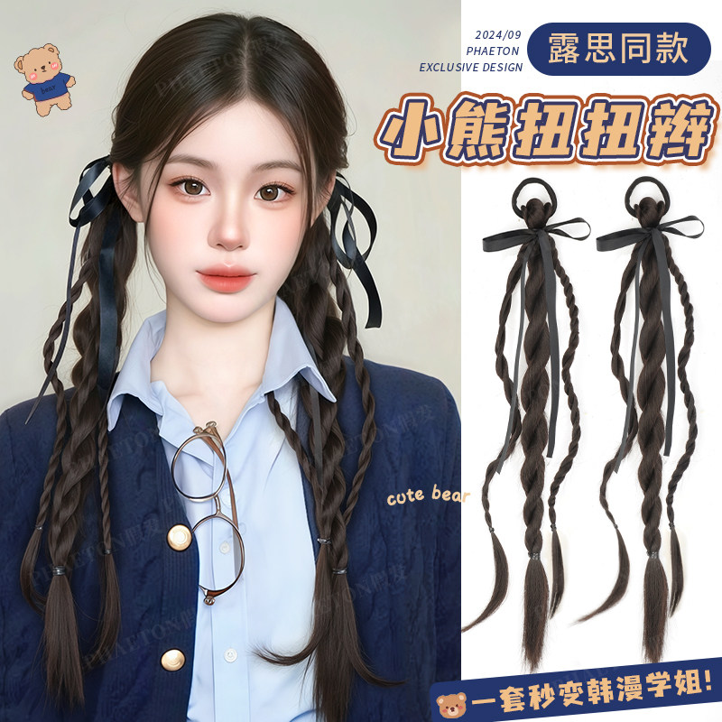 📚 假发辫子女自然仿真芭蕾风双麻花小熊丝带扭扭辫新中式假发马尾辫