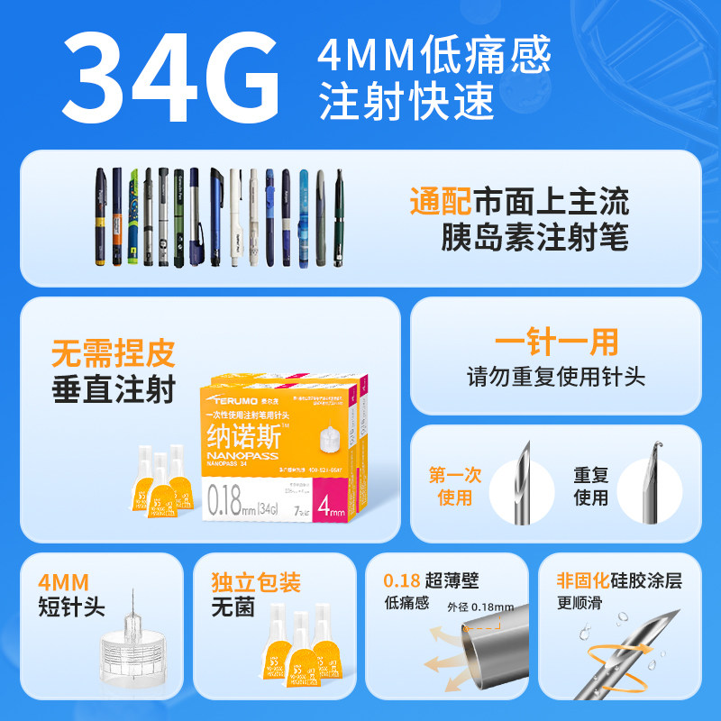📚 日本进口泰尔茂胰岛素针头34G4mm微微痛通用注射0.18mm一次性针头