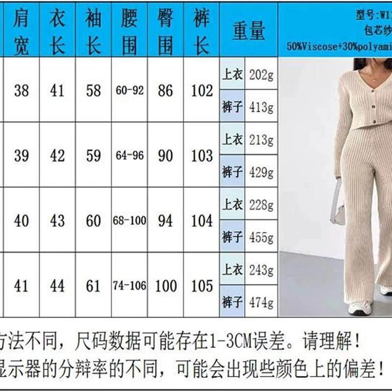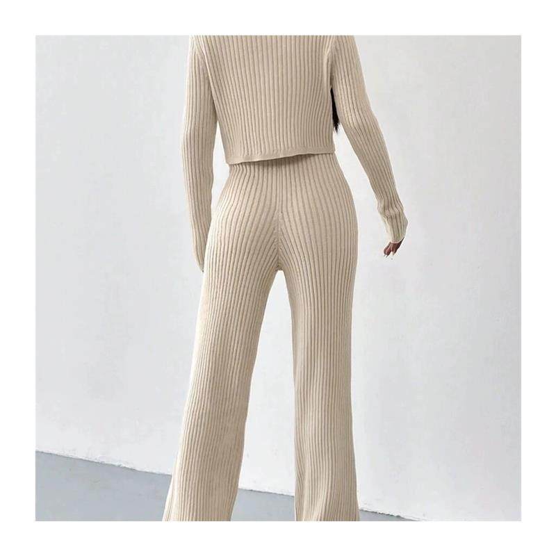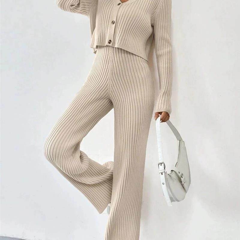 📚 欧美秋冬时尚休闲直筒裤宽松V领坑条针织套装 Loose Knitted Set