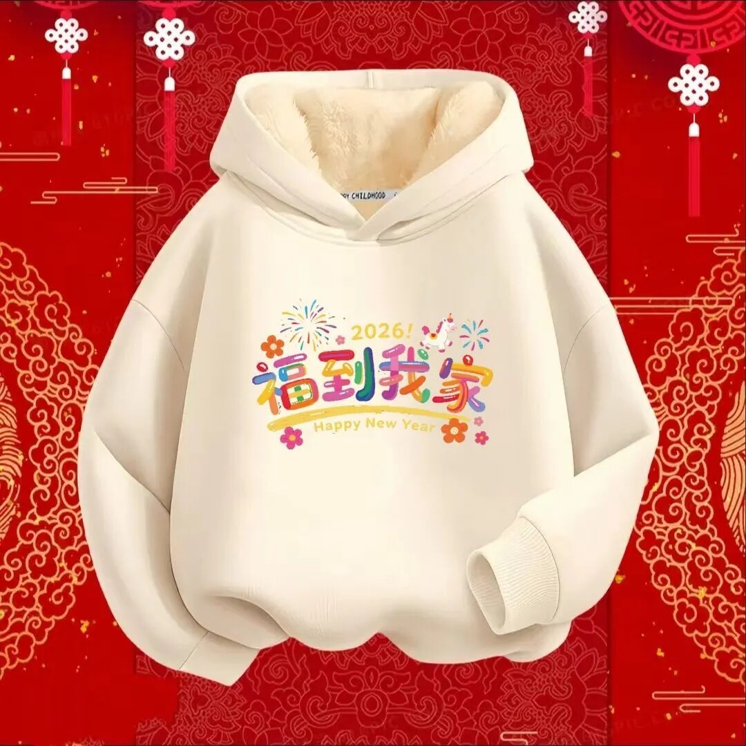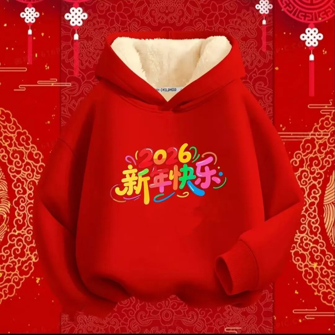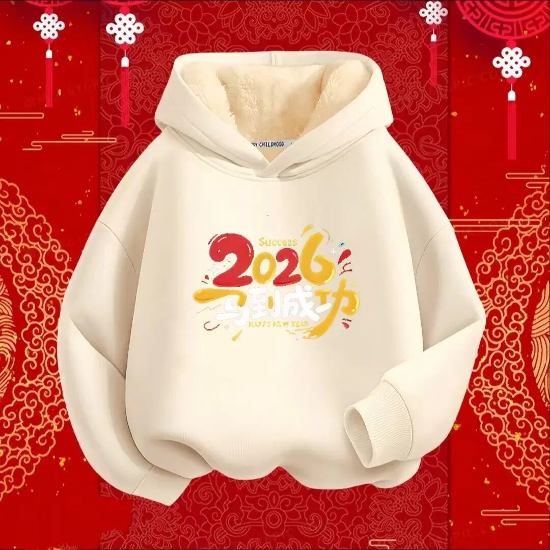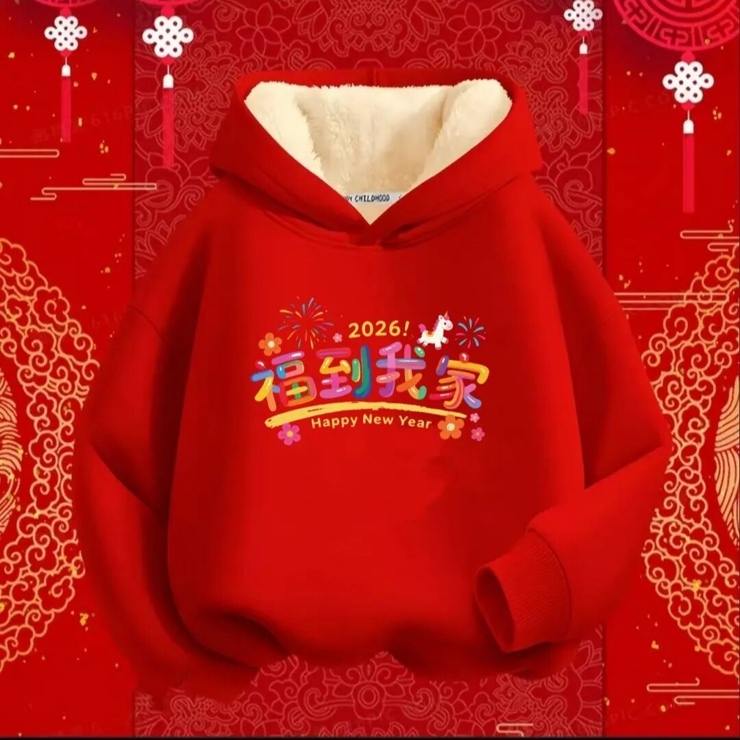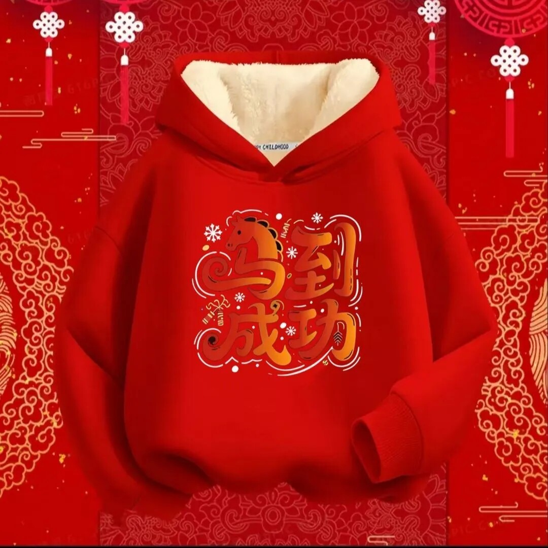 📚 马到成功趣味国潮秋冬加绒连帽卫衣男女童长袖上衣儿童喜庆拜年服