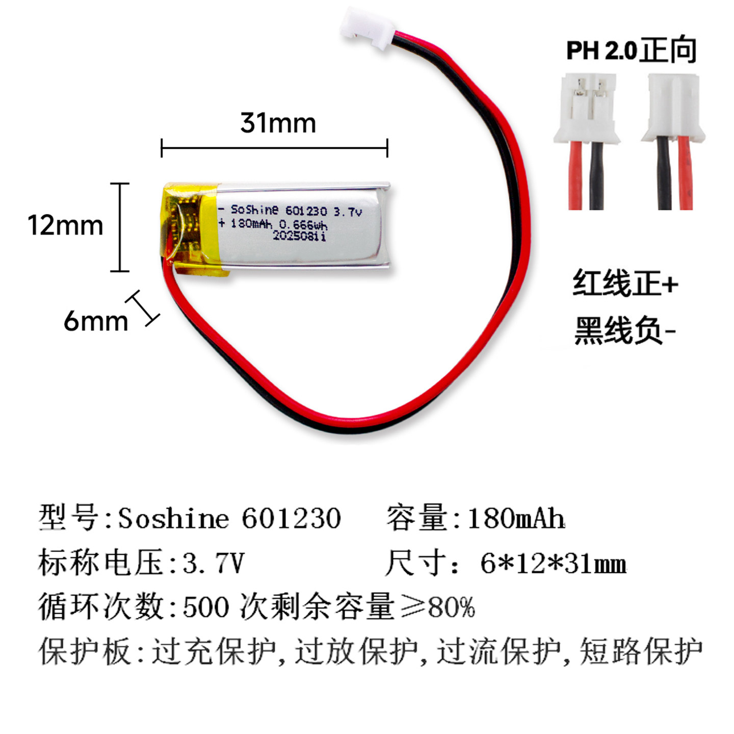 📚 601230 3.7v聚合物锂电池180mah蓝牙耳机录音笔智能穿戴充电软包