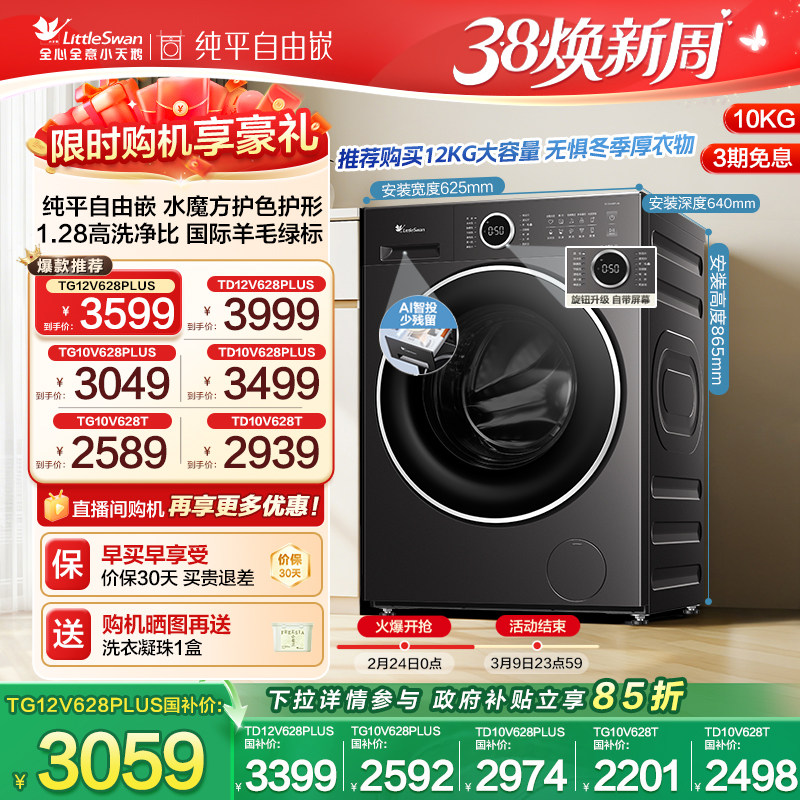 📚 [纯平自由嵌]小天鹅 10/12KG水魔方滚筒洗烘一体洗衣机628PLUS/T