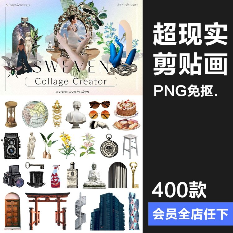 📚 超现实梦幻拼贴手帐剪贴画动物鸟类建筑花朵景观物件PNG免抠素材