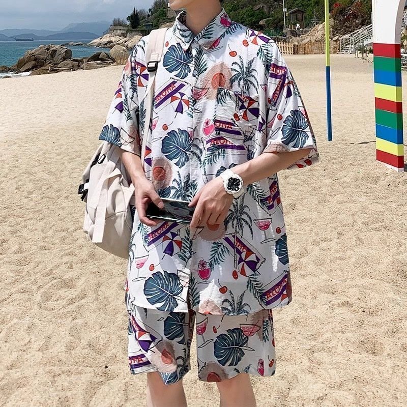 📚 夏季短袖套装花衬衫+短裤沙滩度假风泰国夏威夷男女情侣装泼水节