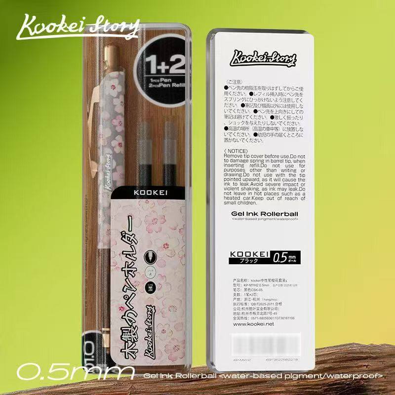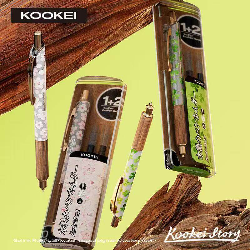 📚 KOOKEI中性笔樱花幸运四叶草限定款原木笔握1+2套装笔CS笔尖速干0.5mm按动式水笔冬季雪花黑色学生刷题签字笔
