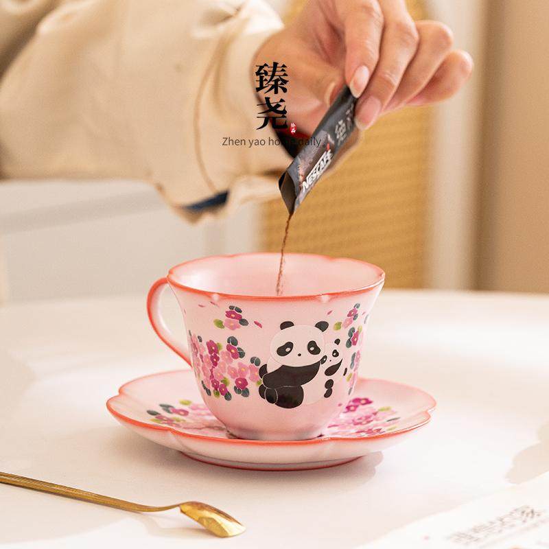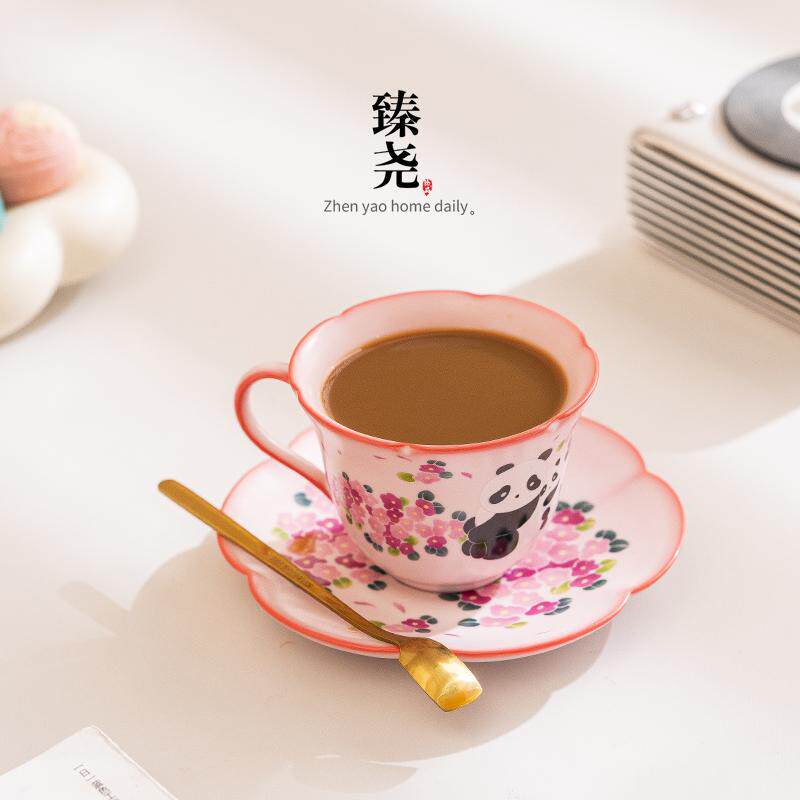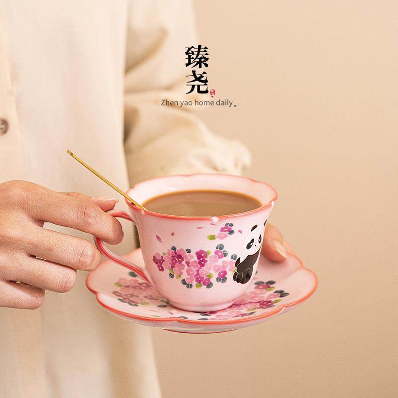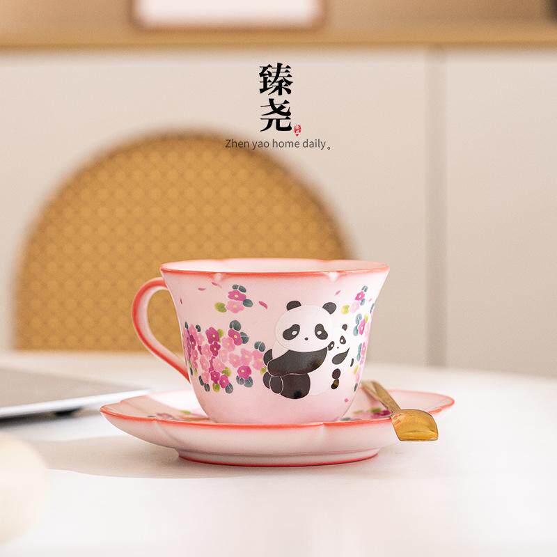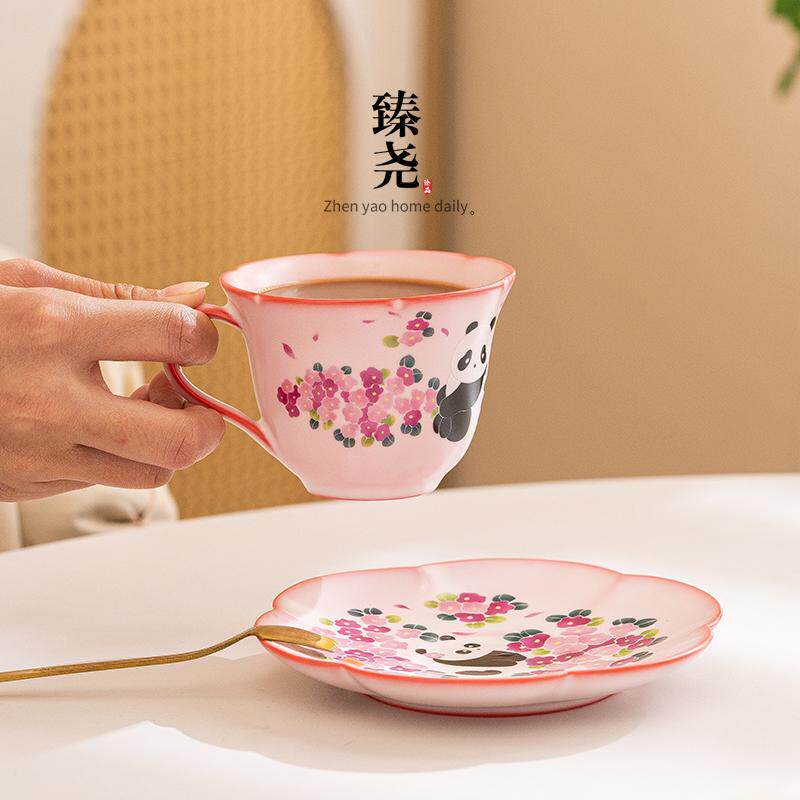 📚 臻尧粉色猪油冻熊猫咖啡杯泡茶杯专用陶瓷茶具高颜值女士主人杯