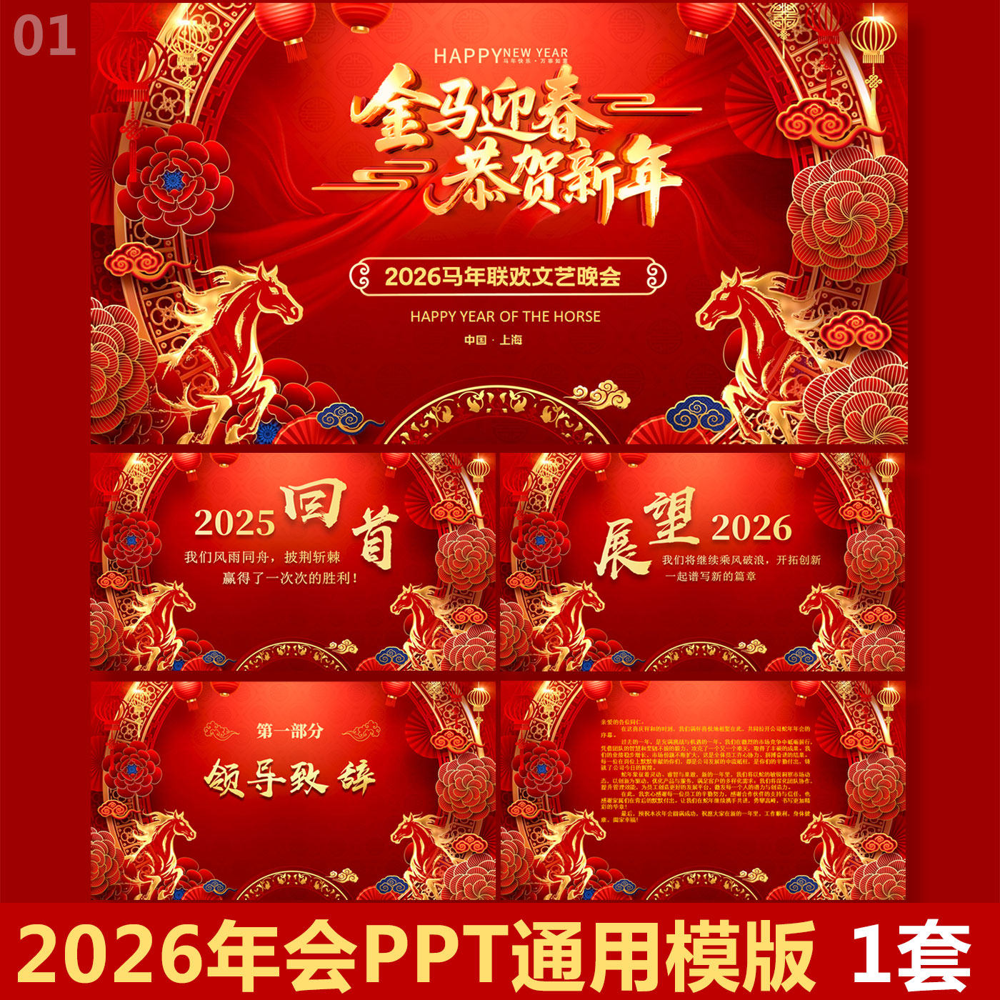 📚 2026马年会PPT通用红色大气模版春晚舞台背景设计企业尾牙ppt