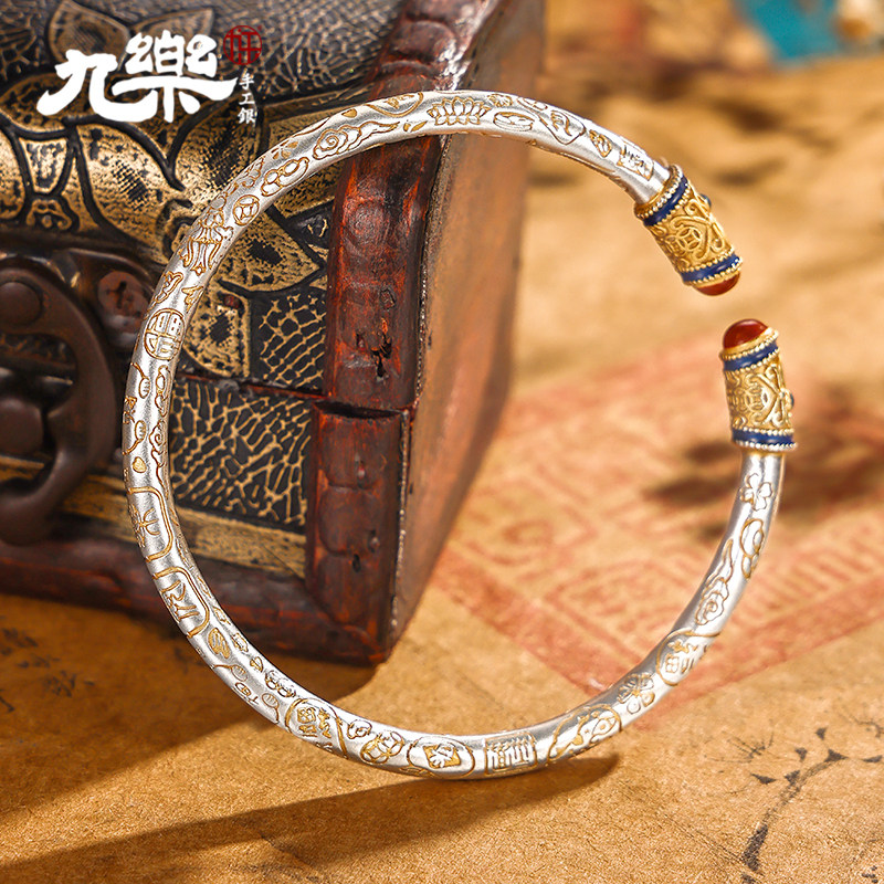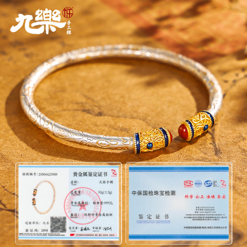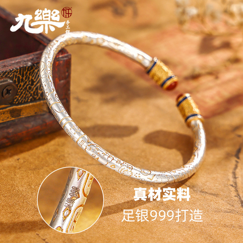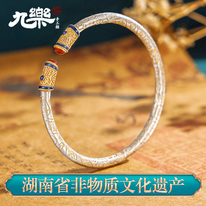 📚 九乐足银999银手镯女描金吉言圆棍珐琅手镯新中式国风首饰送女友