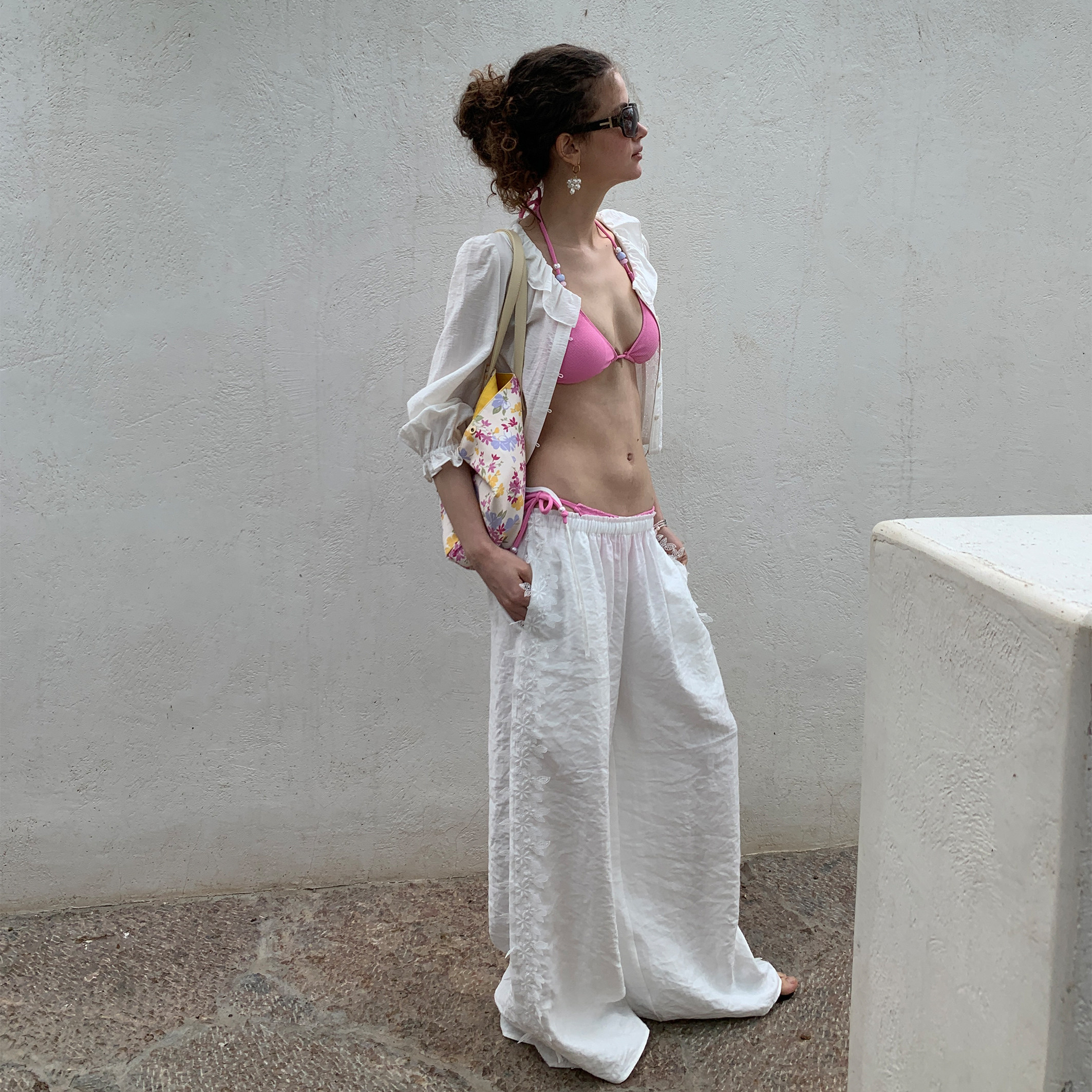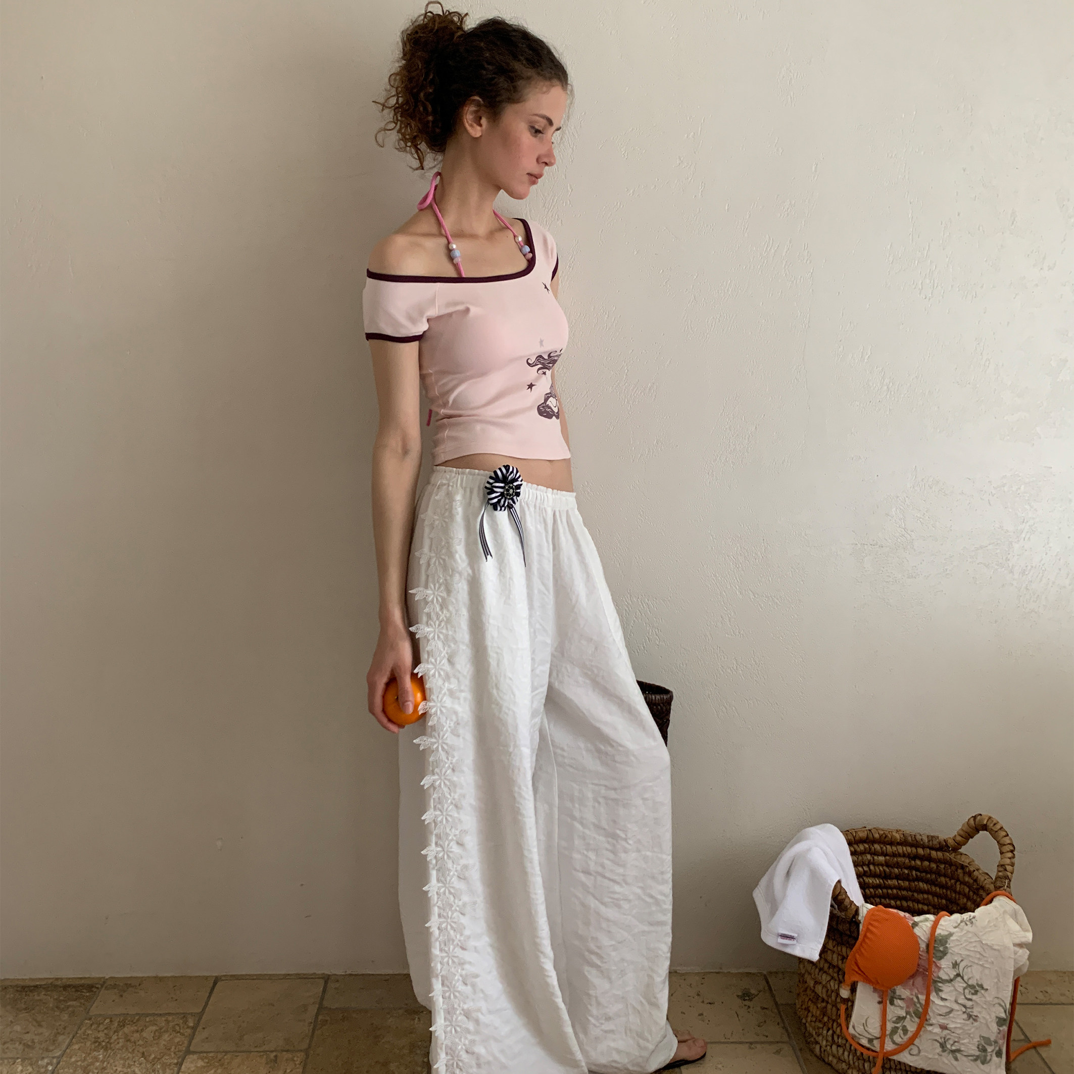 📚 花筏NOTJUSTHIM白色花边休闲海滩度假阔腿裤