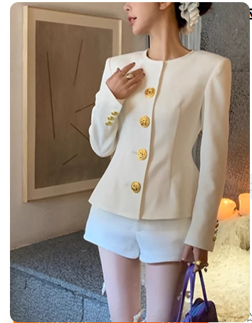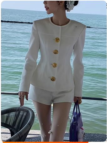 📚 周美美同款 名伶千金金色纽扣立体造型剪裁小香上衣短裤套装