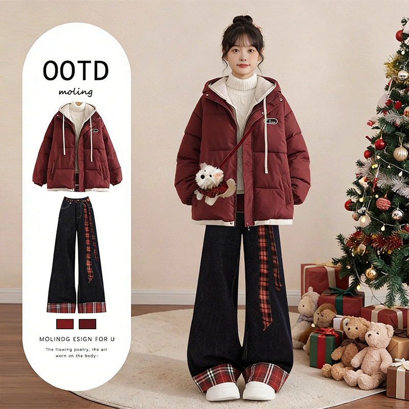 📚 入冬衣服圣诞穿搭冬季一整套女2025新款假两件红棉服牛仔裤两件套