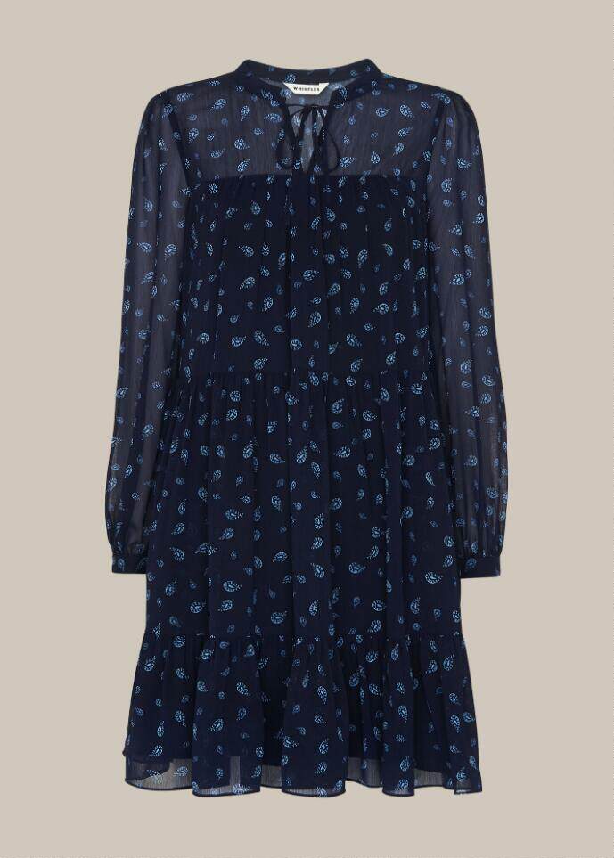 📚 WHISTLES长袖连衣裙纱网秋深蓝印花碎花羽状复古英伦通勤气质百搭