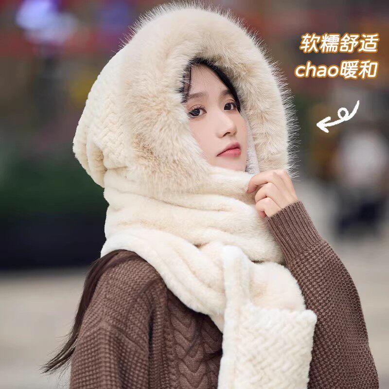 📚 帽子女2024冬季新款加厚毛绒围巾三件套围脖一体骑车防风保暖防寒