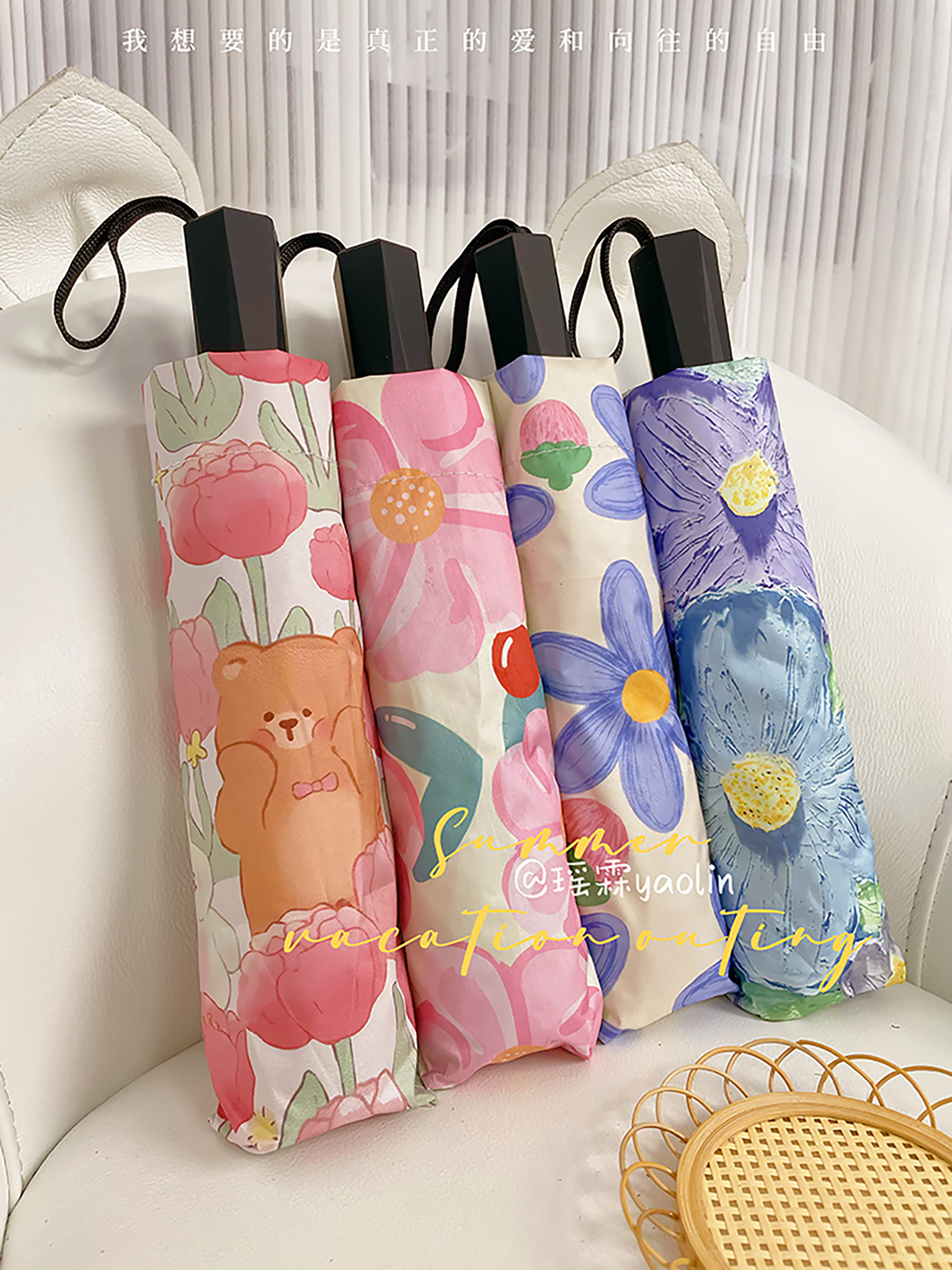 📚 折叠便携口袋雨伞女士晴雨两用黑胶高颜值学生手动可爱卡通五折伞