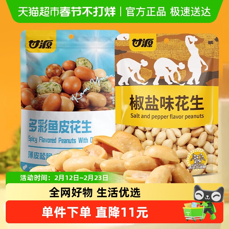 📚 甘源脱油椒盐味花生+多彩鱼皮花生208g*2袋下酒菜夜宵搭档组合