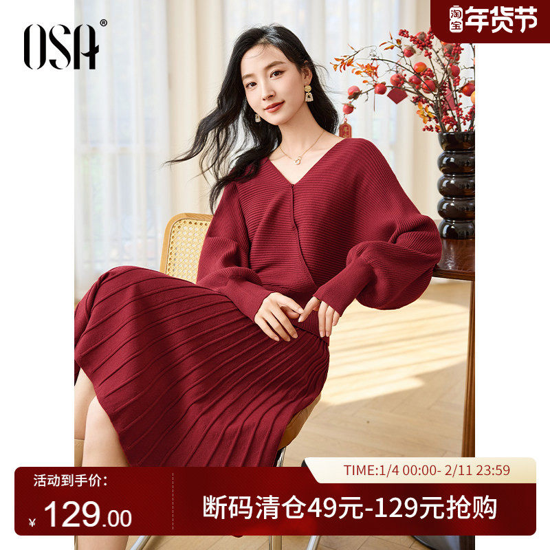 📚 【新年红装】OSA轻熟连衣裙套装V领针织衫半身裙两件套女秋冬新款